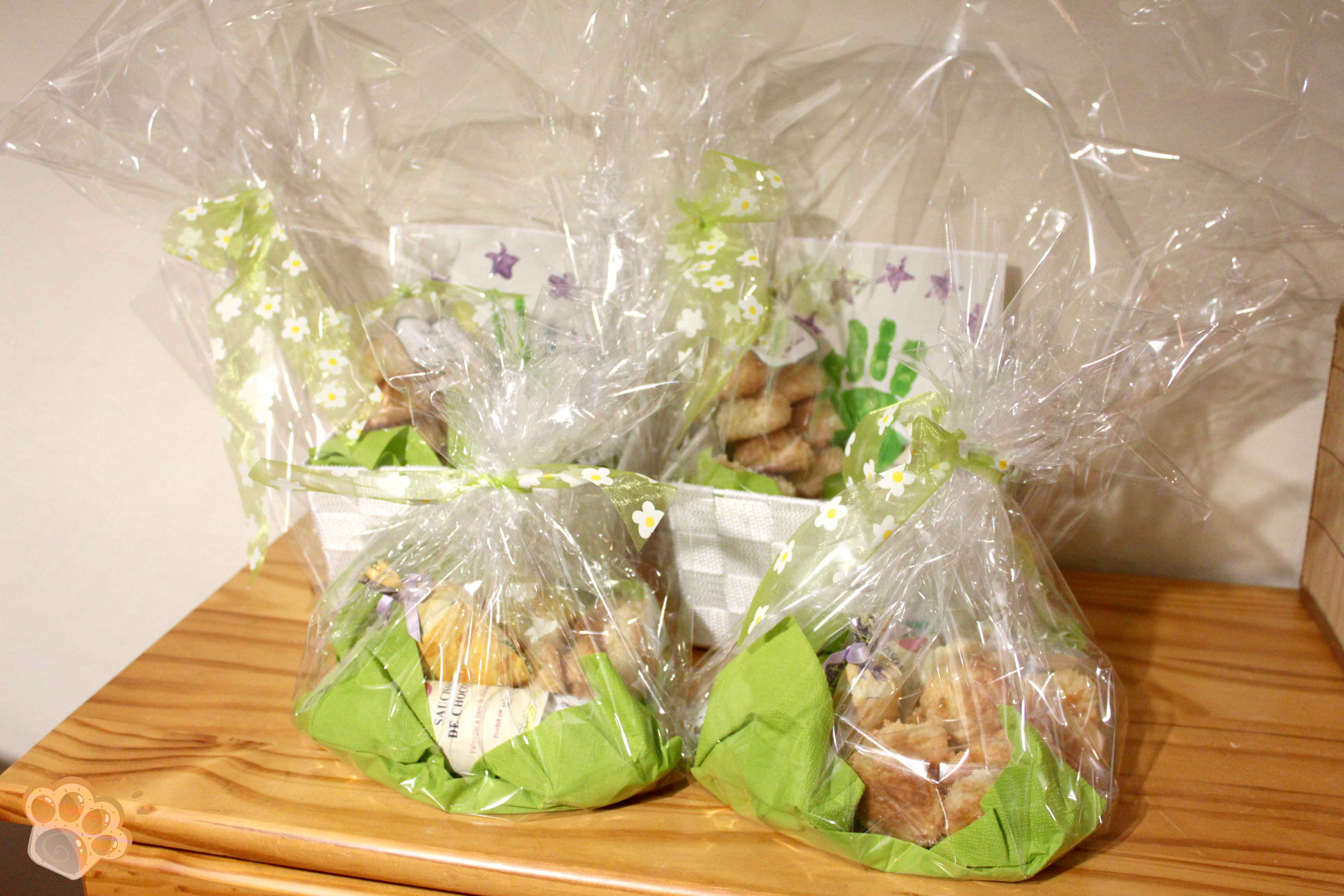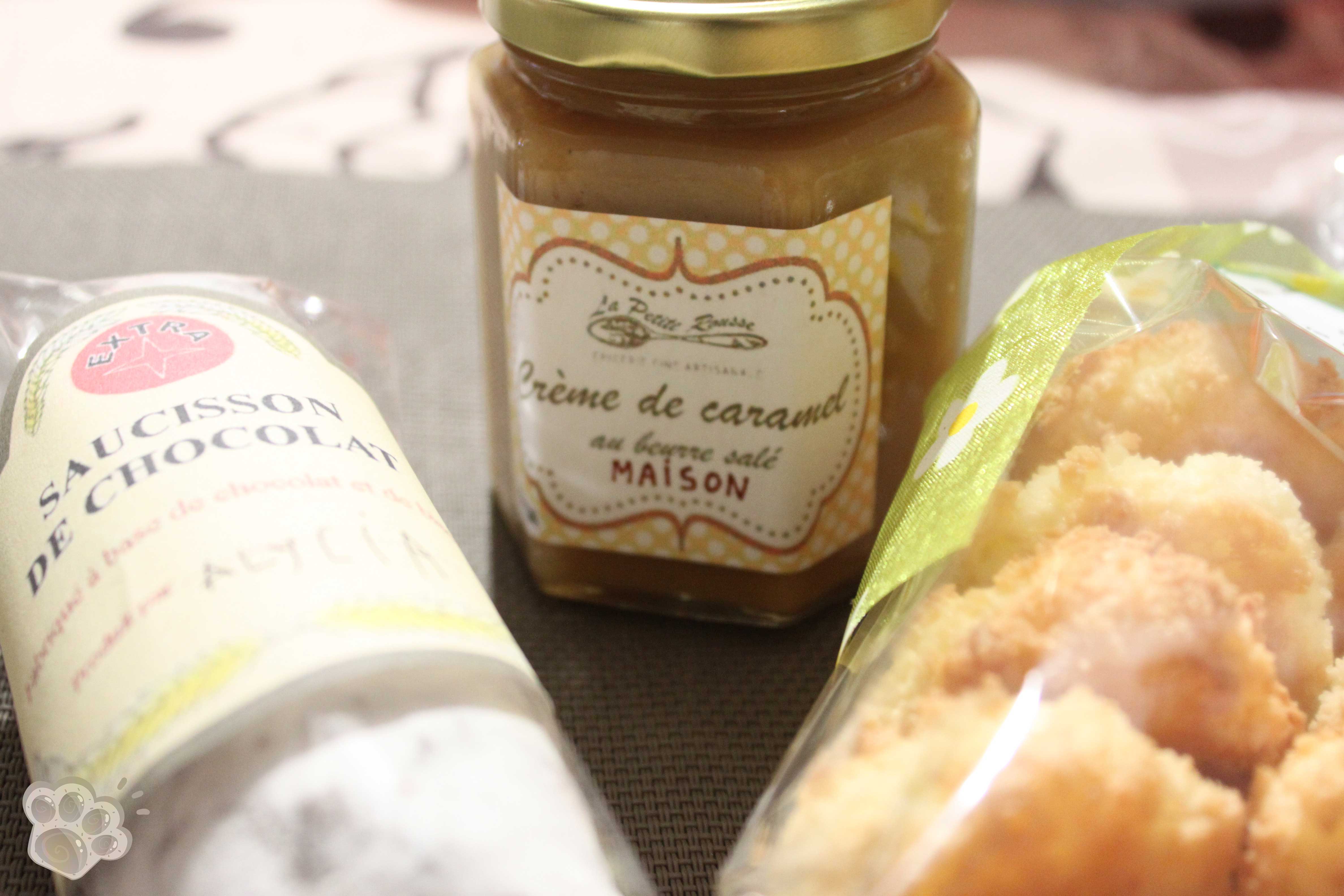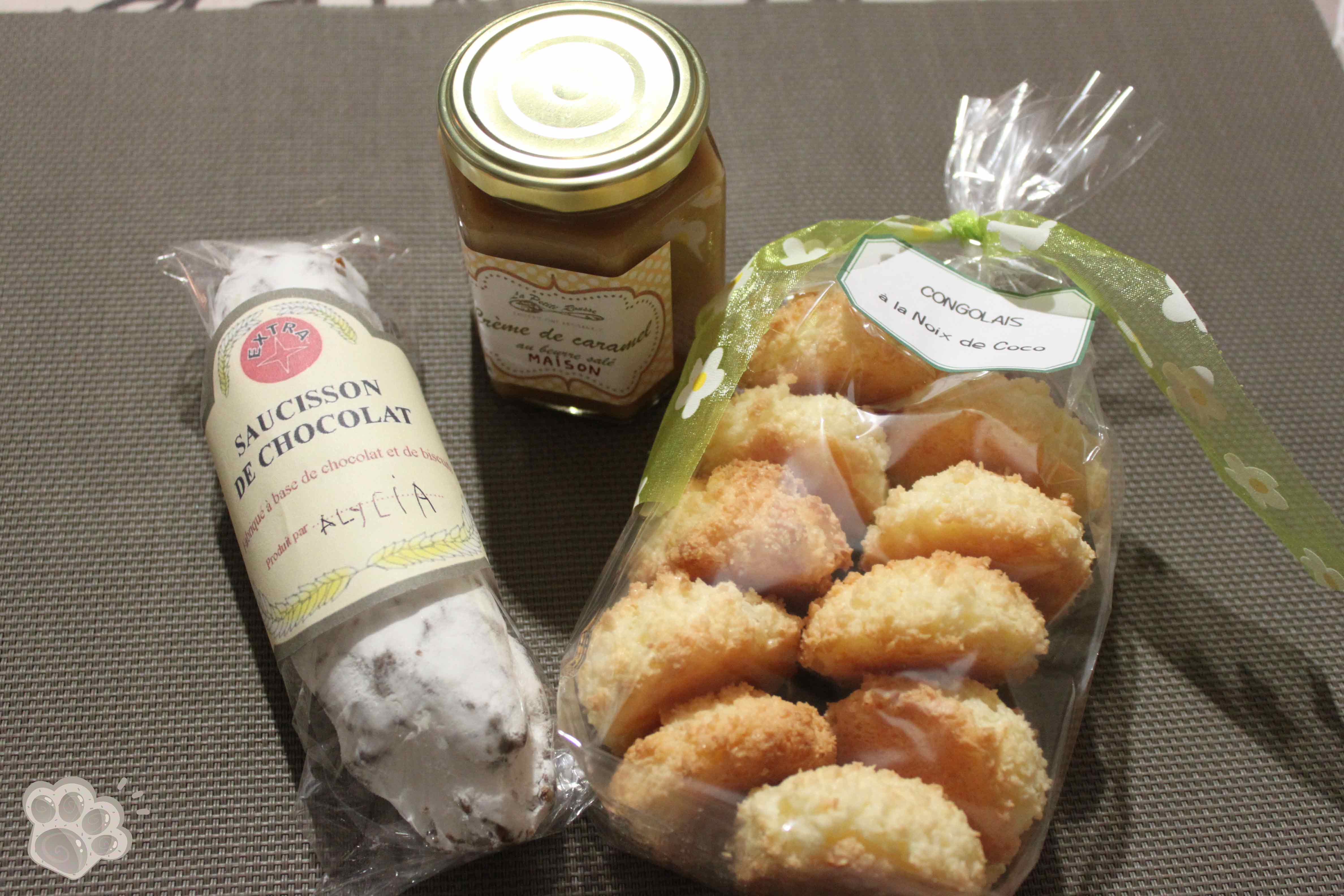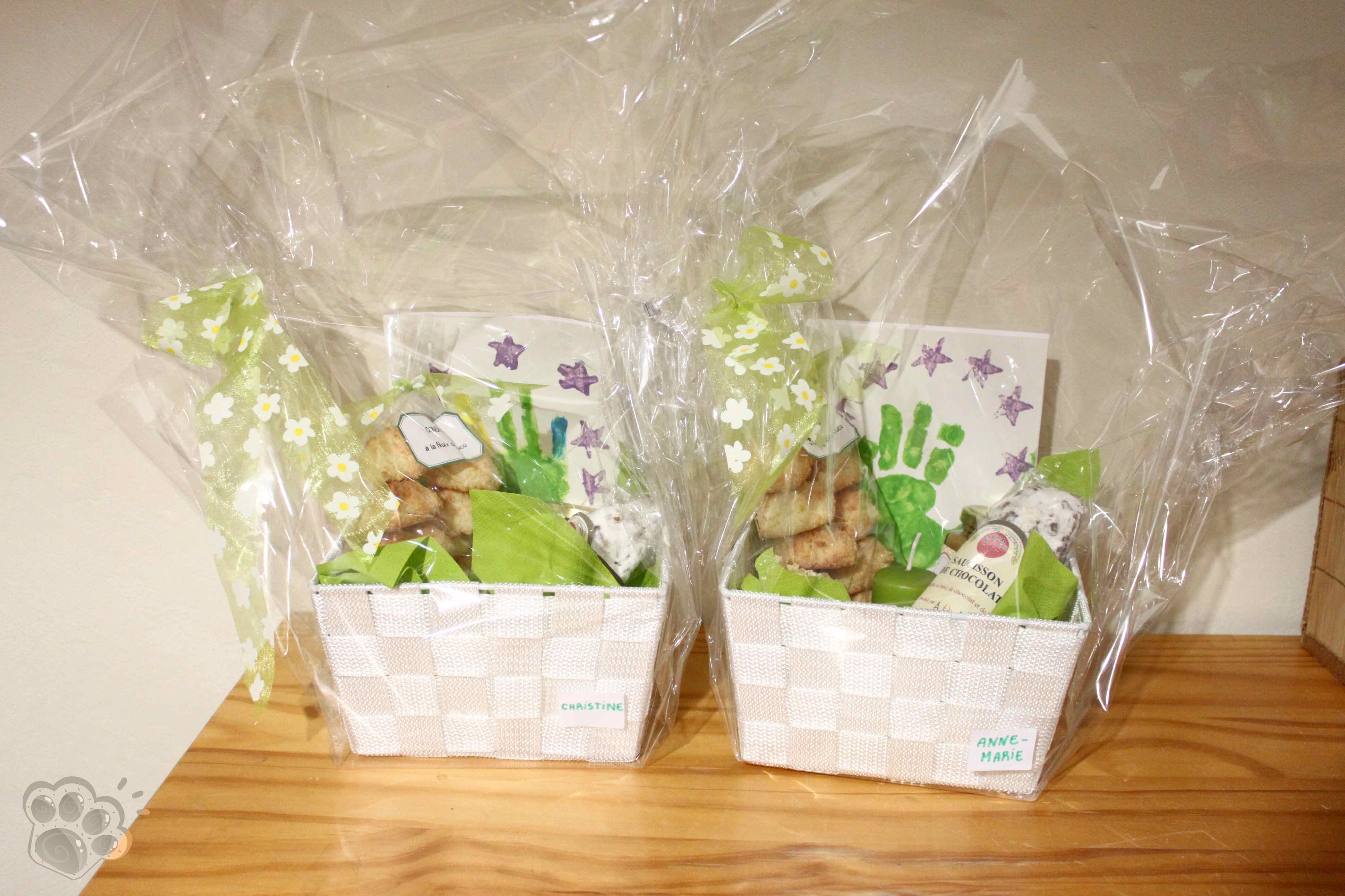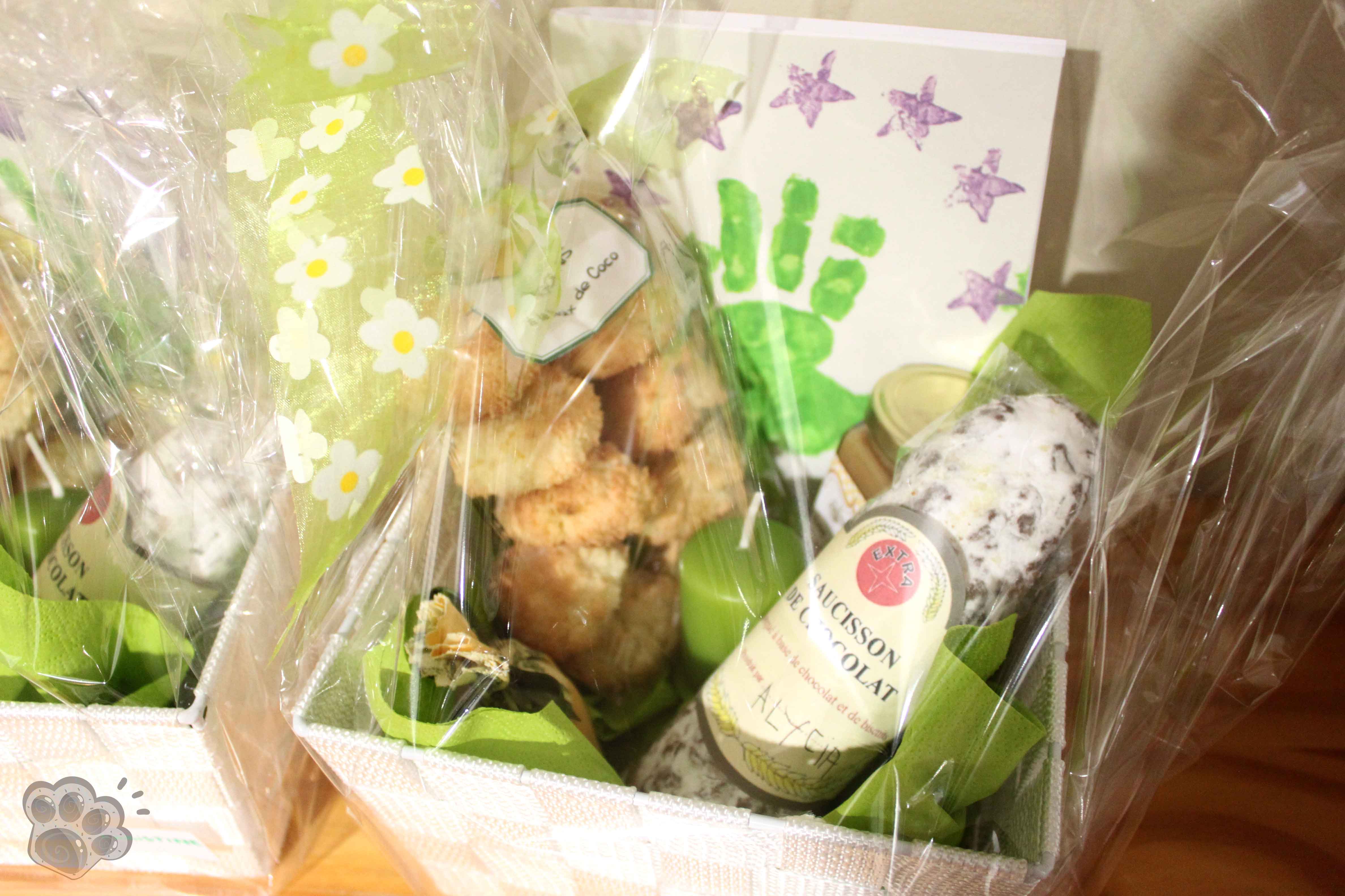 Ces 3 gourmandises ont été présentées dans des panières blanches trouvées à Casa avec une bougie verte et une carte de remerciements avec une peinture faite par ma fille, qu’en pensez-vous?