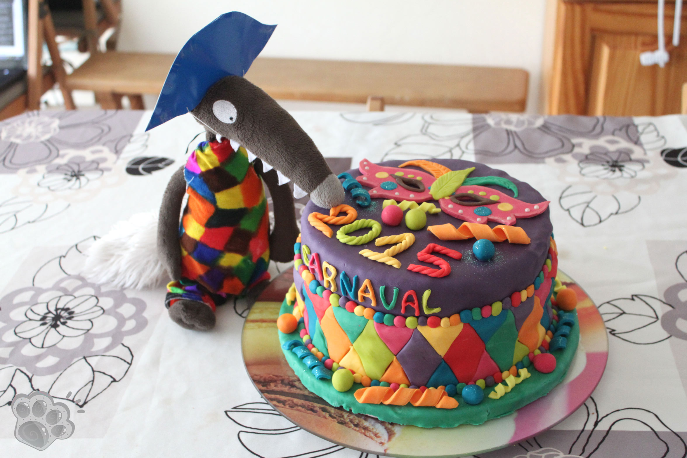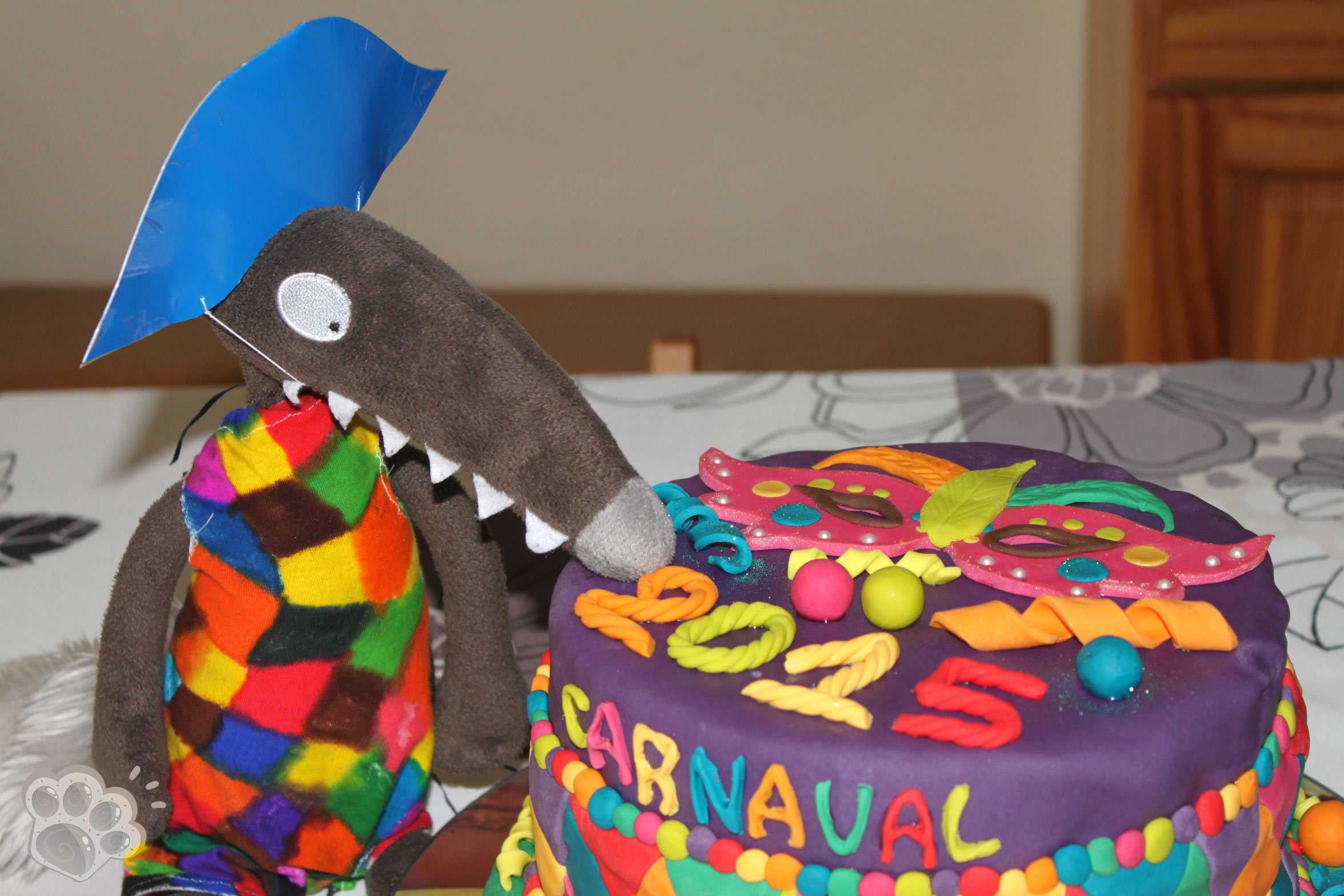 Pour le carnaval de l’école en mars 2015, Alycia est en moyenne section et chaque week-end un enfant de la classe doit s’occuper de leur peluche mascotte « Petit-Loup ». Ce week-end c’est notre tour! Après avoir fabriqué tant bien que mal le déguisement arlequin de Petit-Loup il a fallu faire le gâteau qui l’accompagne!