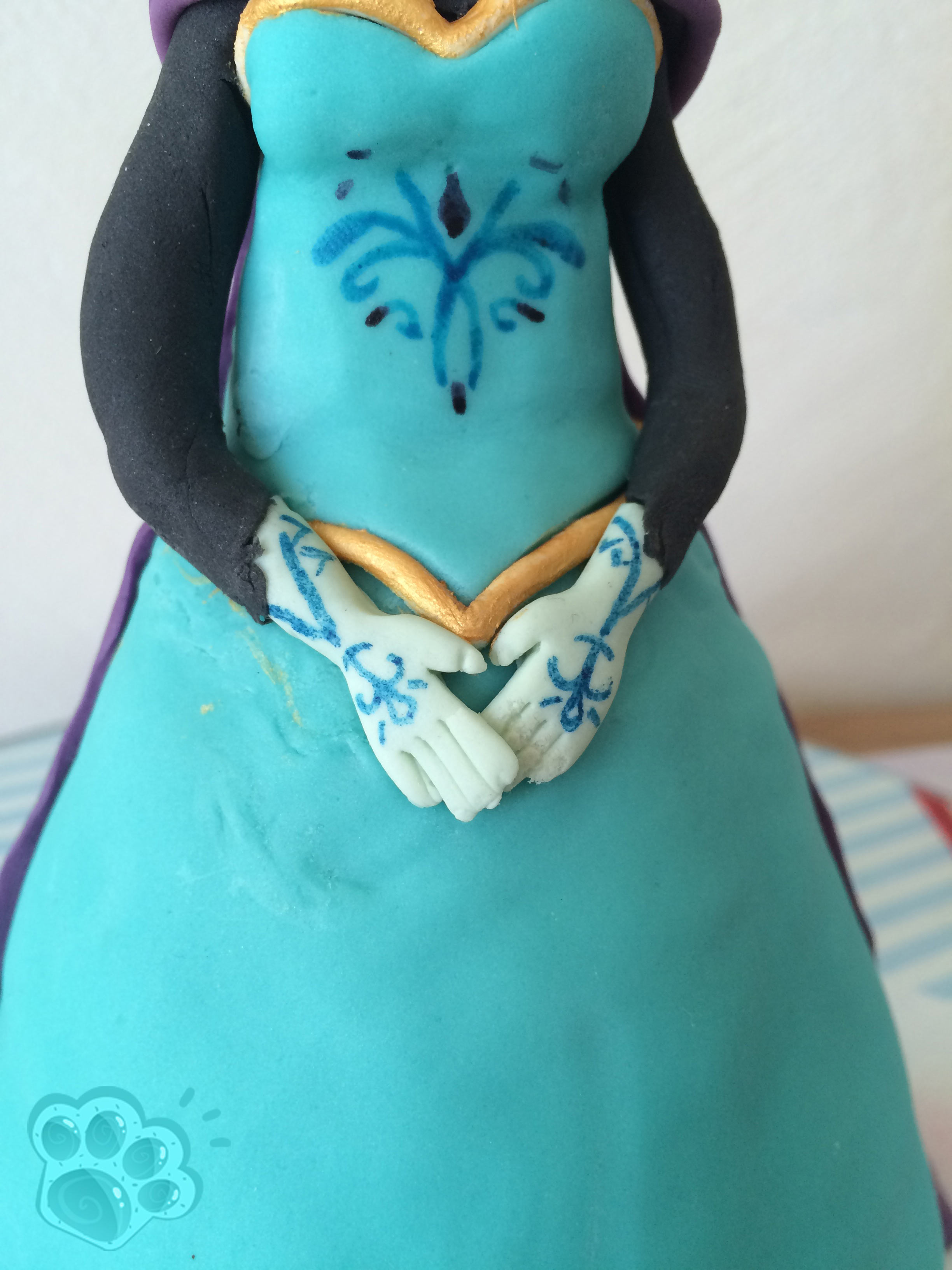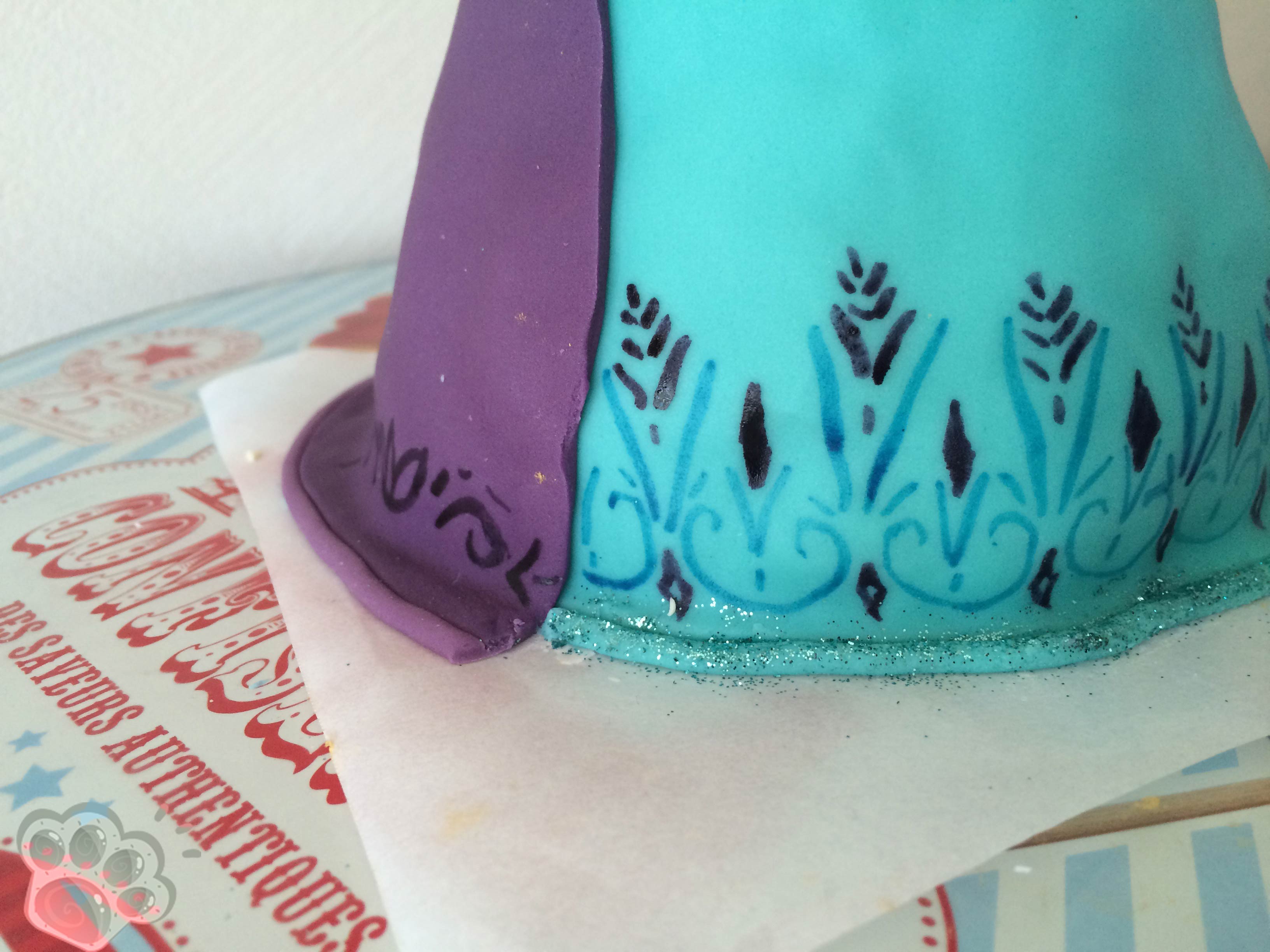 5-Décorer la porte d’entrée du palais : la partie violette est peinte avec de la peinture alimentaire dorée et je découpe un morceau de dentelle alimentaire que je colle sur la pâte à sucre turquoise :