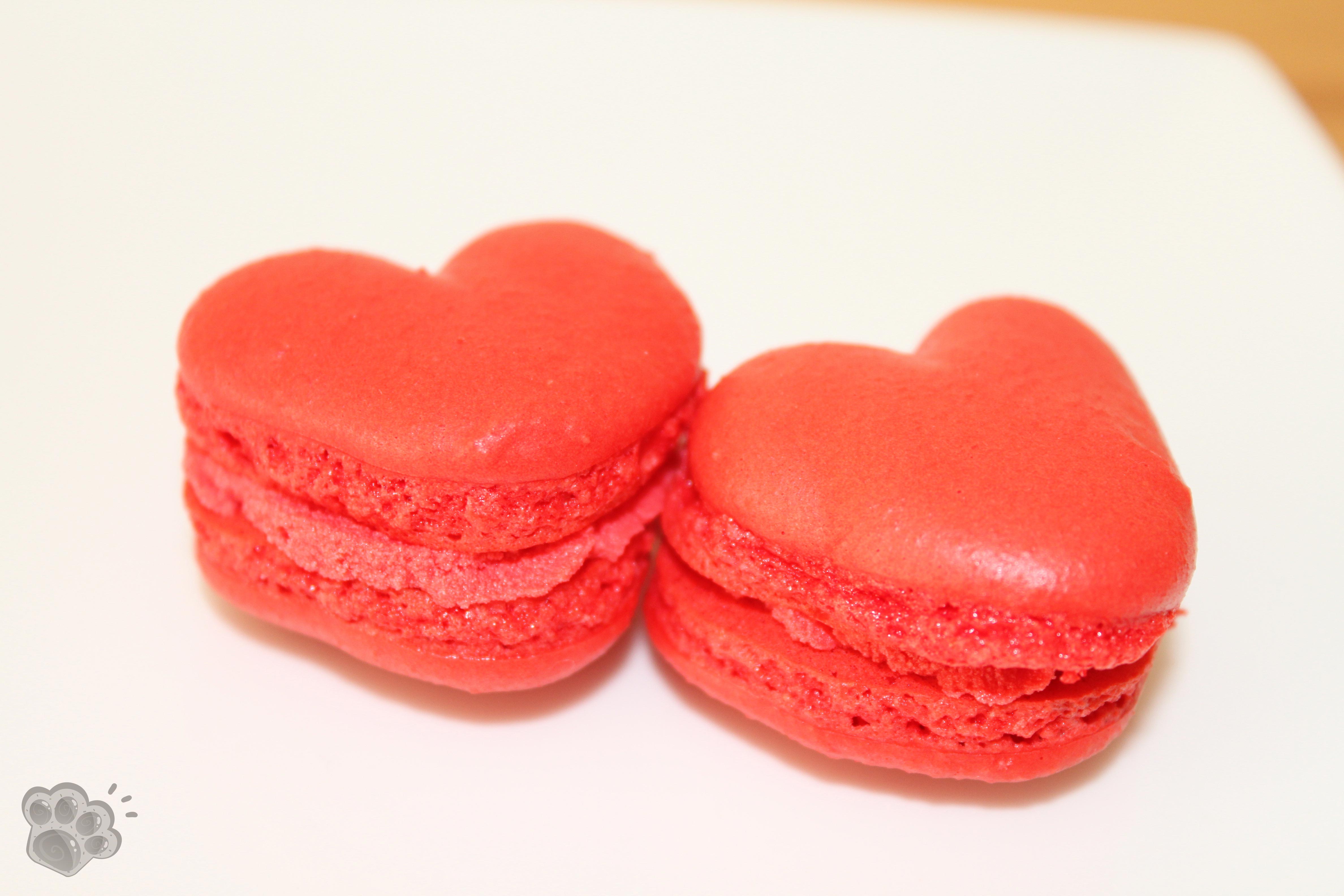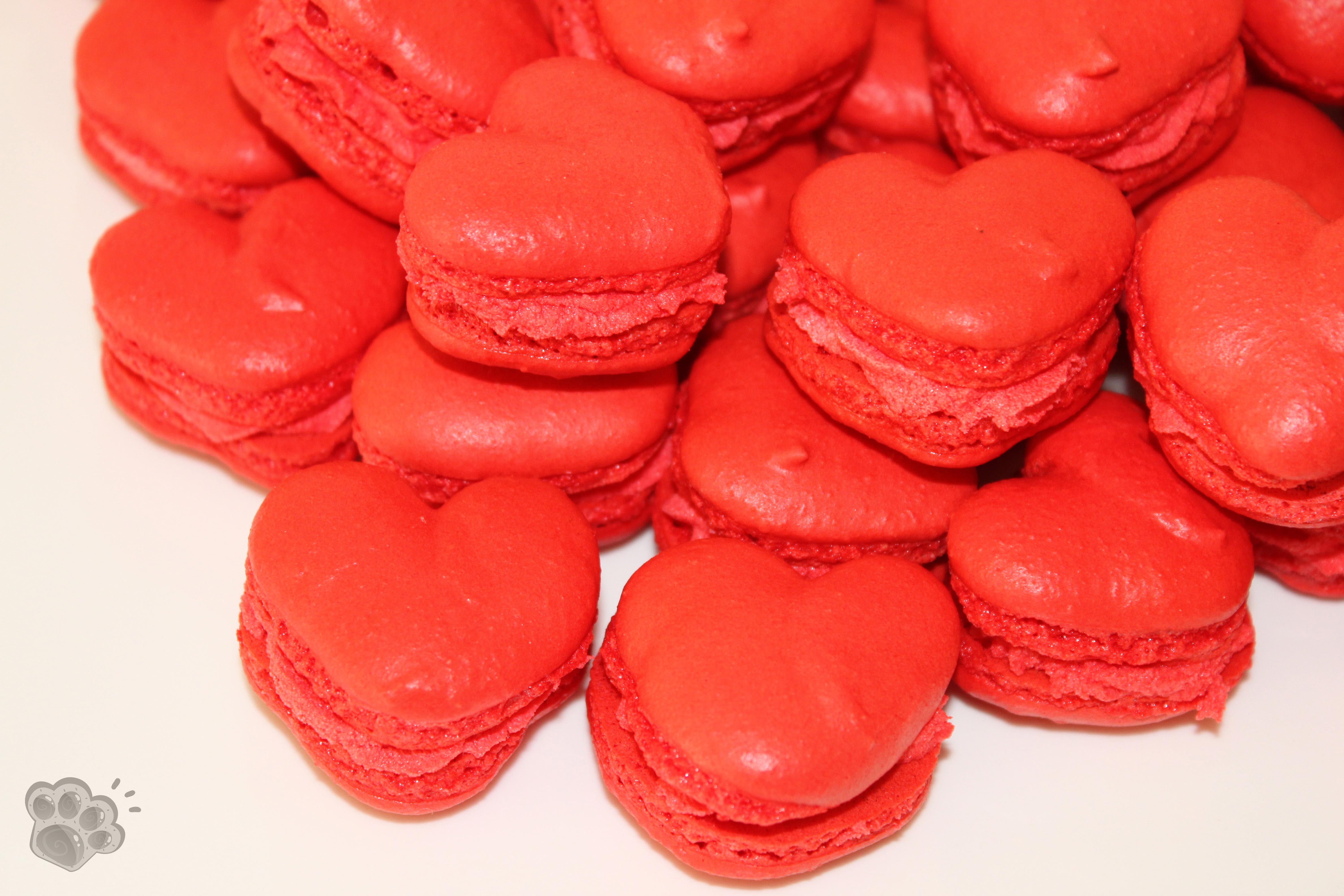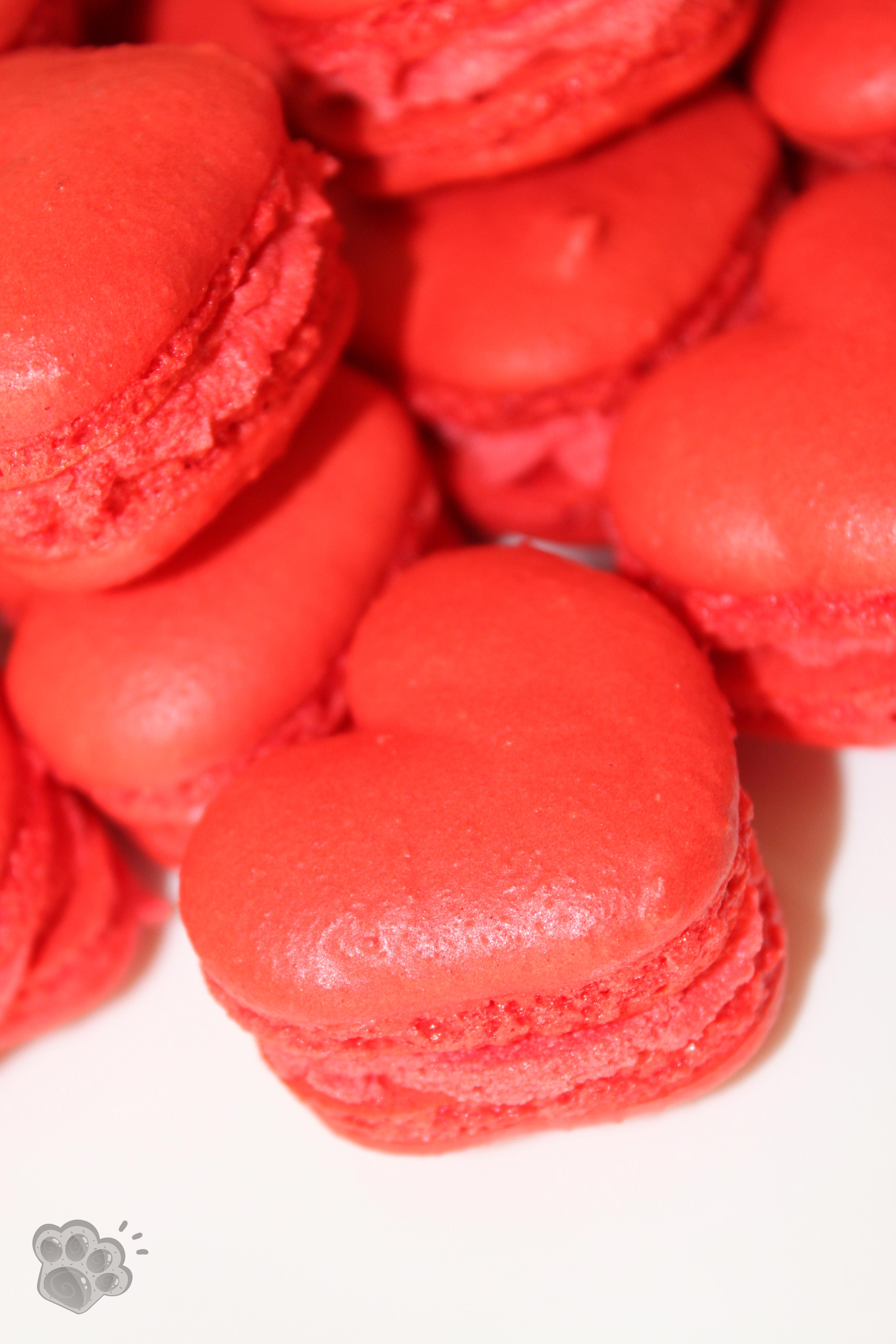 1- Réaliser des coques de macarons en forme de cœur avec ma recette ici et un gabarit forme cœur à imprimer ici. Colorer les coques en rose framboise (ici avec un colorant gel)
