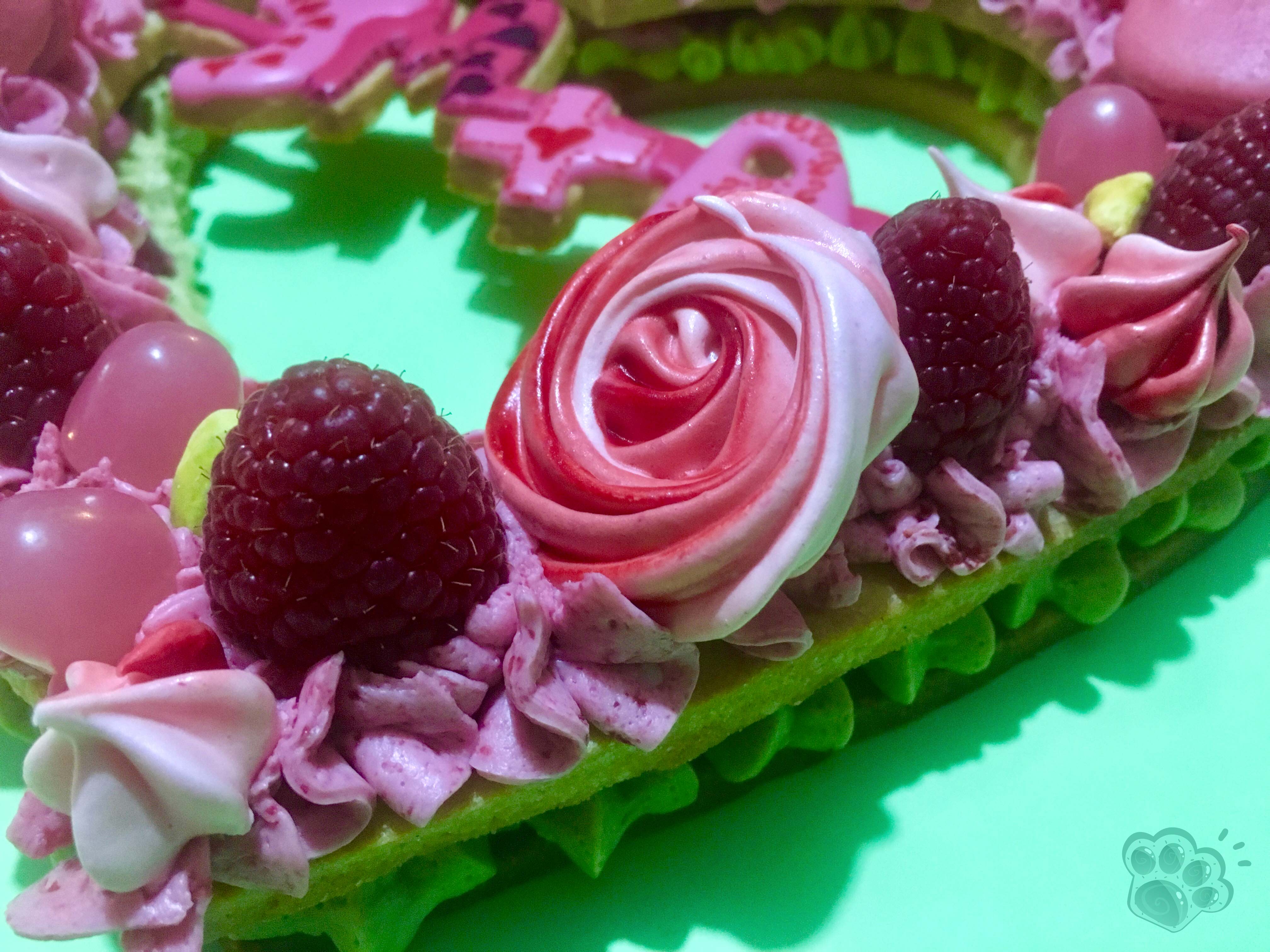 Préparer les décors : Dragibus® roses, framboises fraîches, fleur ou cœur en pâte à sucre, pistaches mondées grillées non salées, macarons fourrés, meringues…