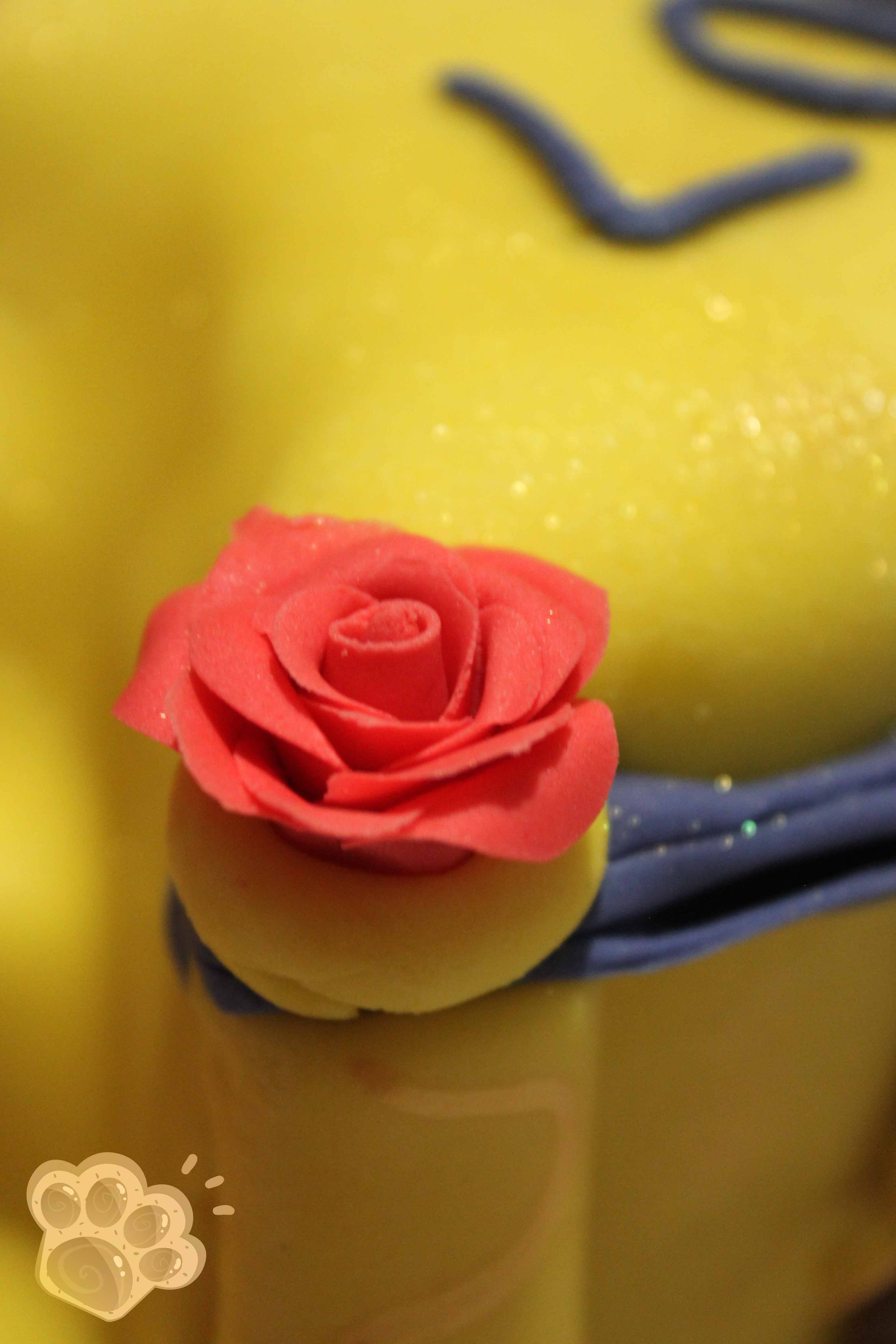 Piquer la rose sur un cure-dent lui-même piqué dans du polystyrène qui a le même diamètre que mon gâteau du bas (il s’agit ici de mon « dummie » c’est-à-dire un faux gâteau que j’avais utilisé pour l’anniversaire de la Reine des Neiges une fête givrée)