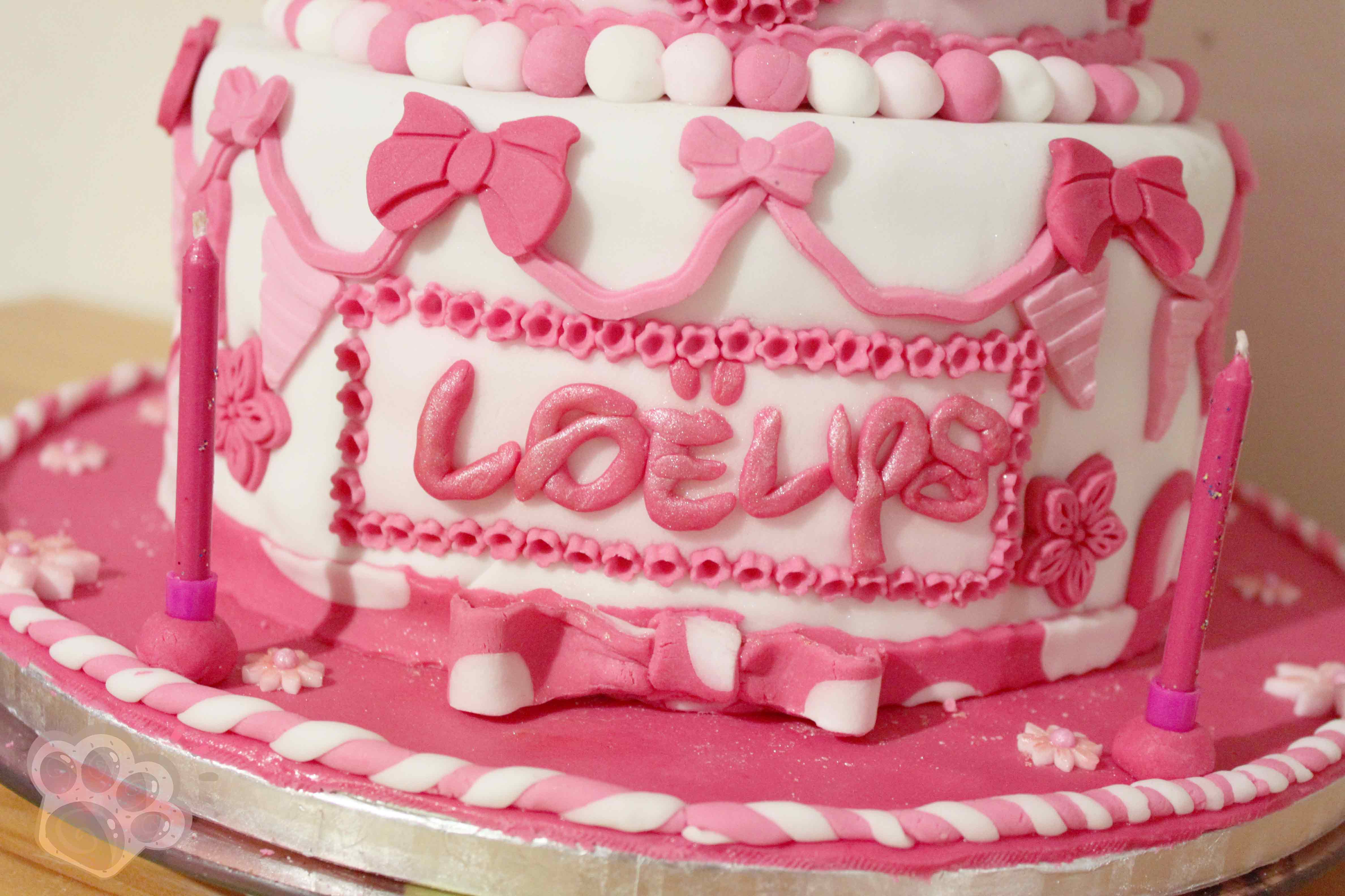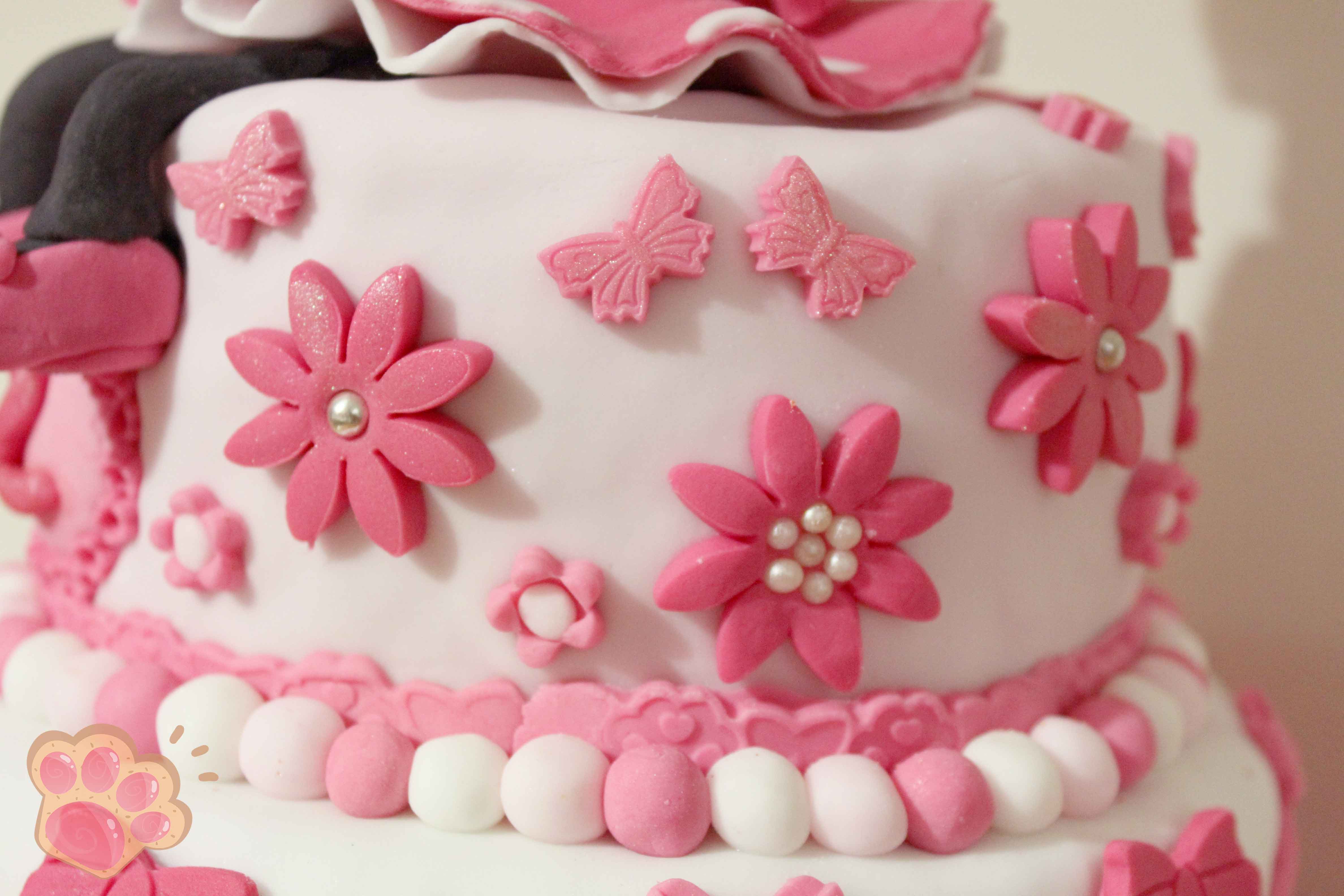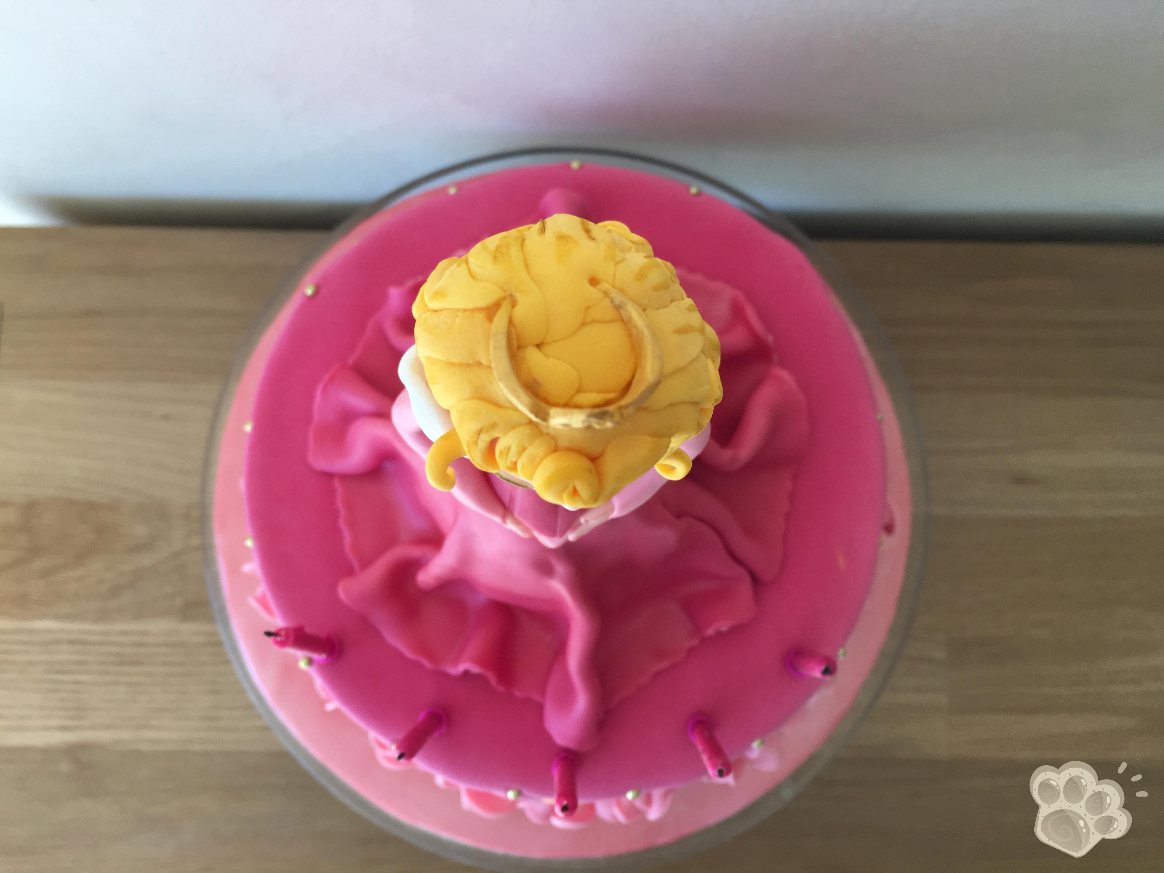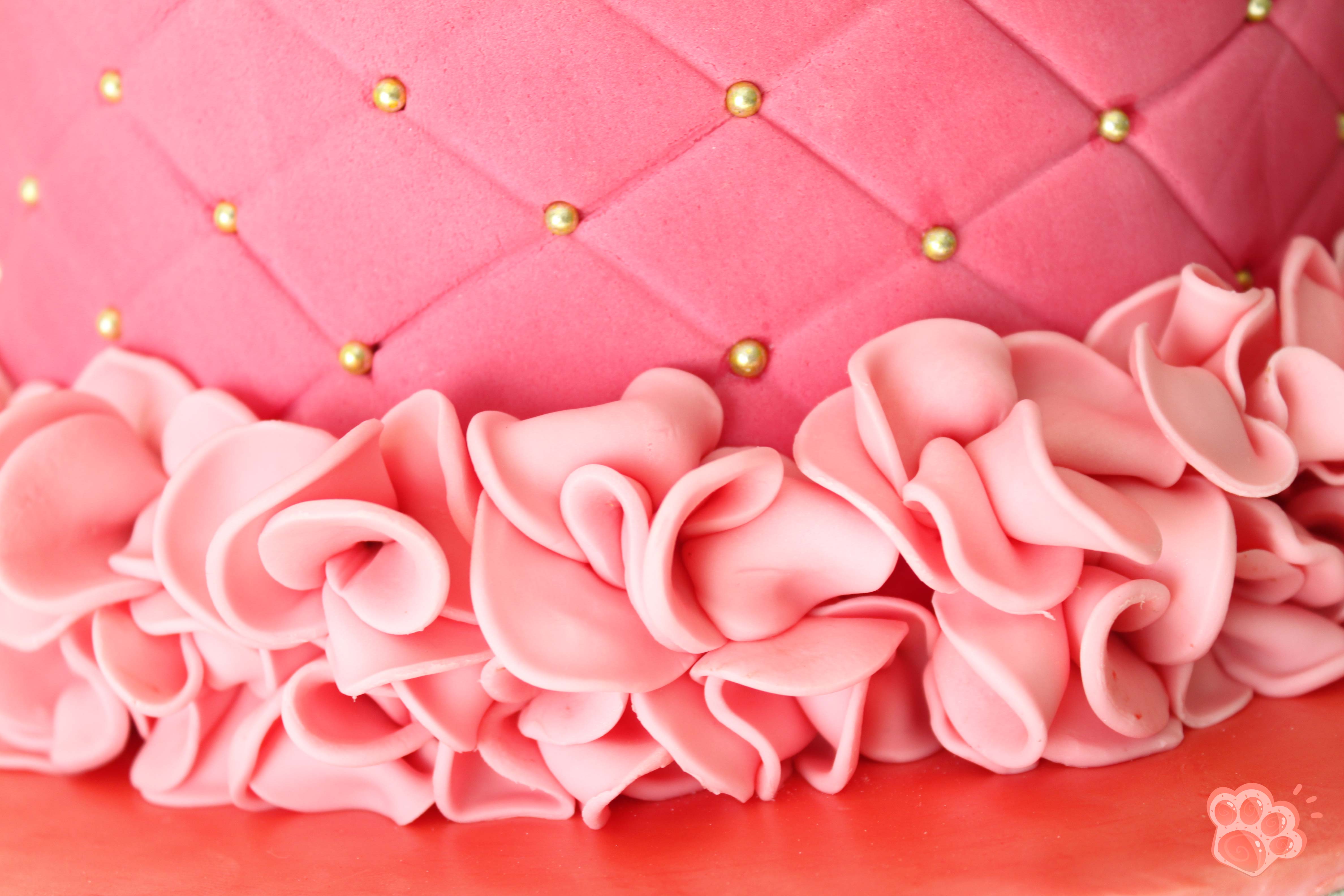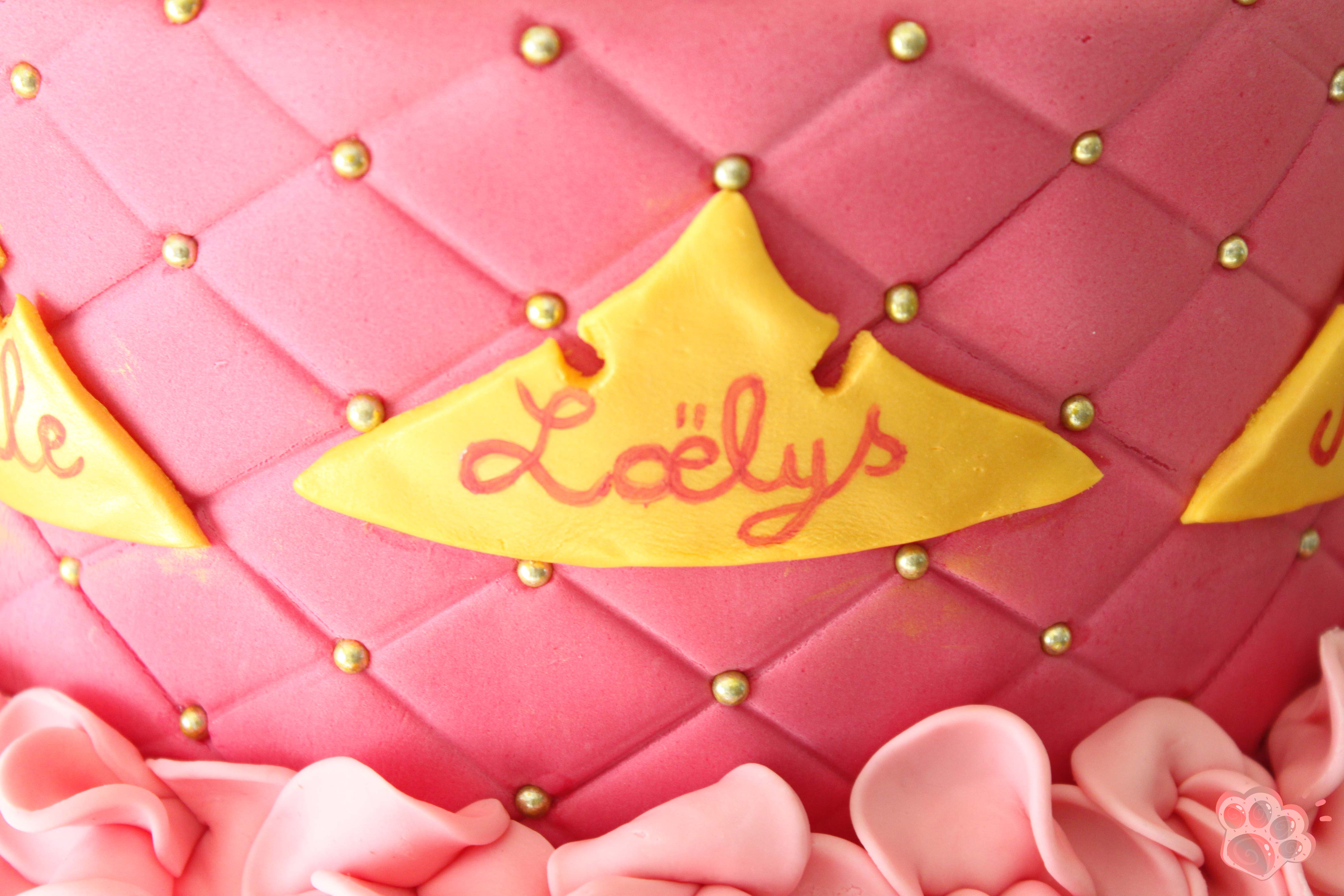6-Mettre le ruban rose en bas du gâteau juste pour situer sa hauteur il faudra l’enlever après pour que la pâte à sucre sèche (grosse erreur de ma part ici je l’ai laissé sur de la pâte à sucre fraîche et elle avait un peu coulé le lendemain sous le ruban)