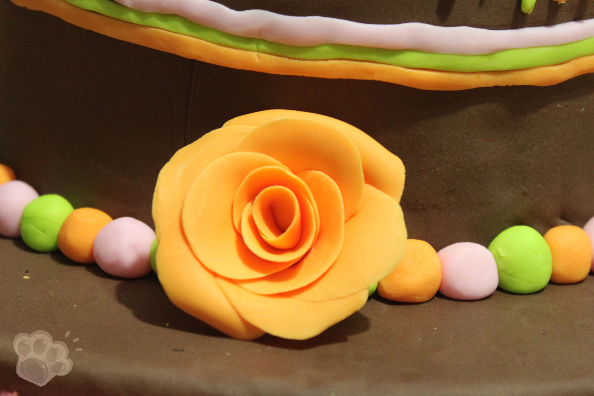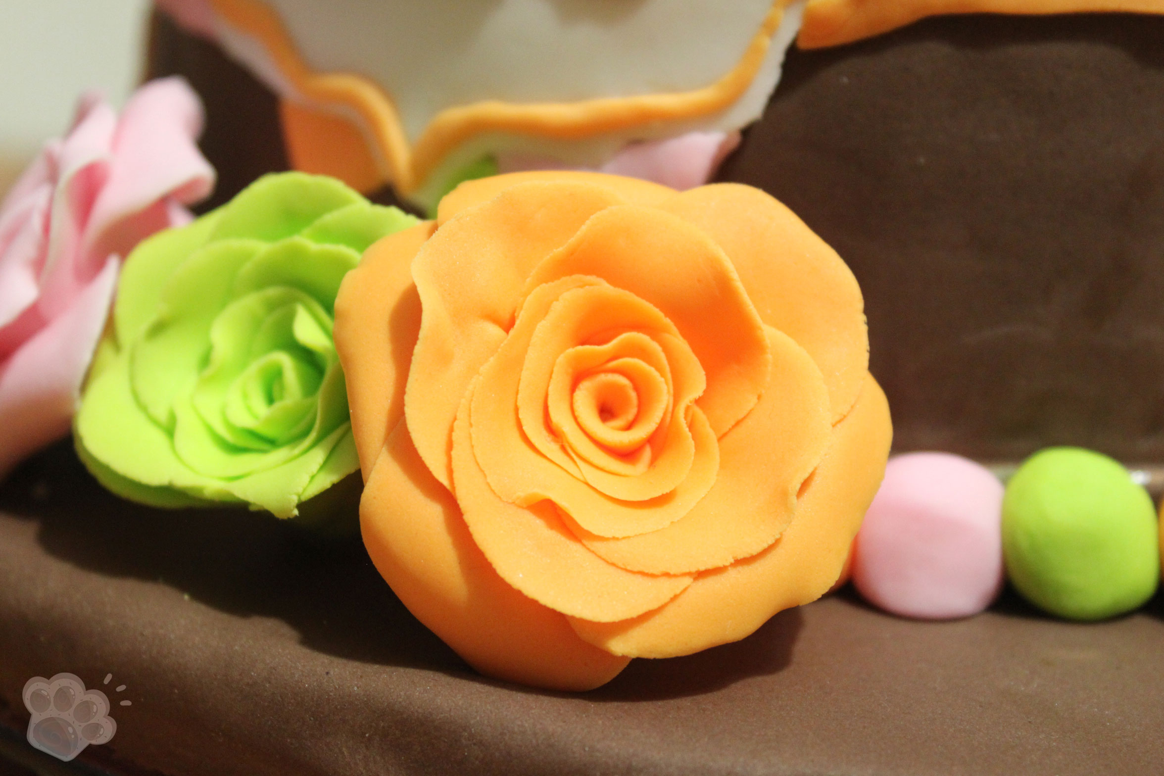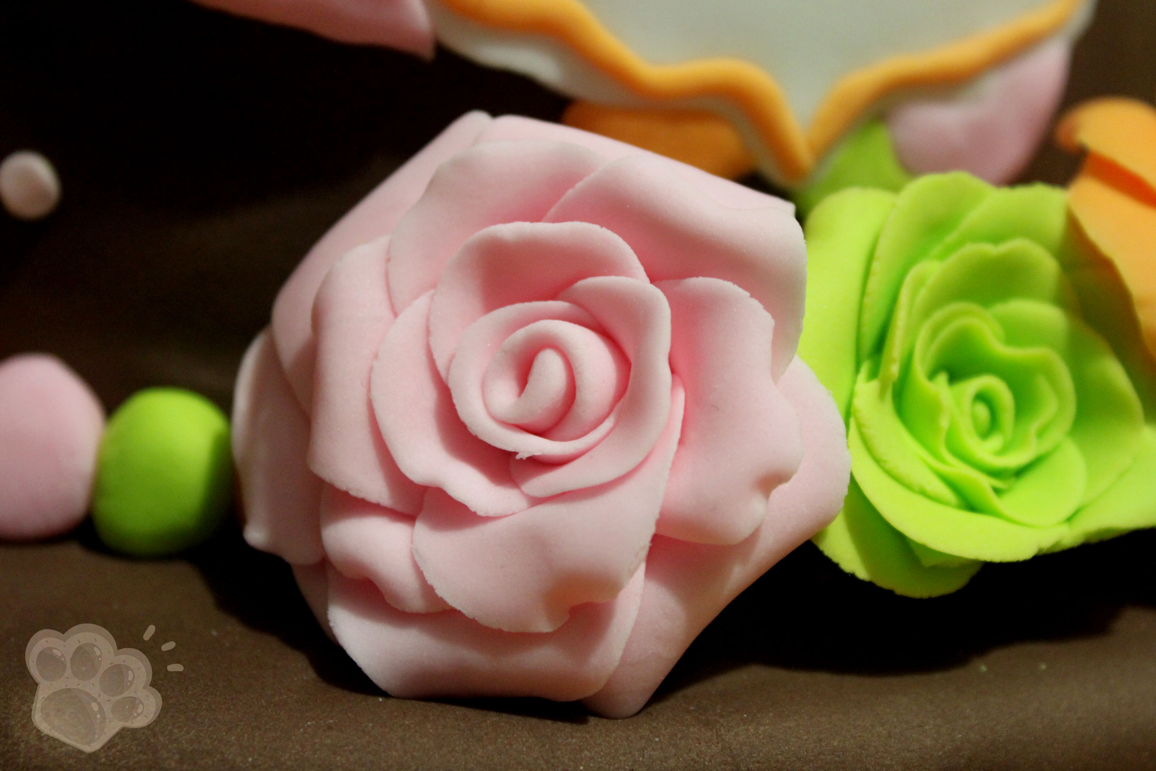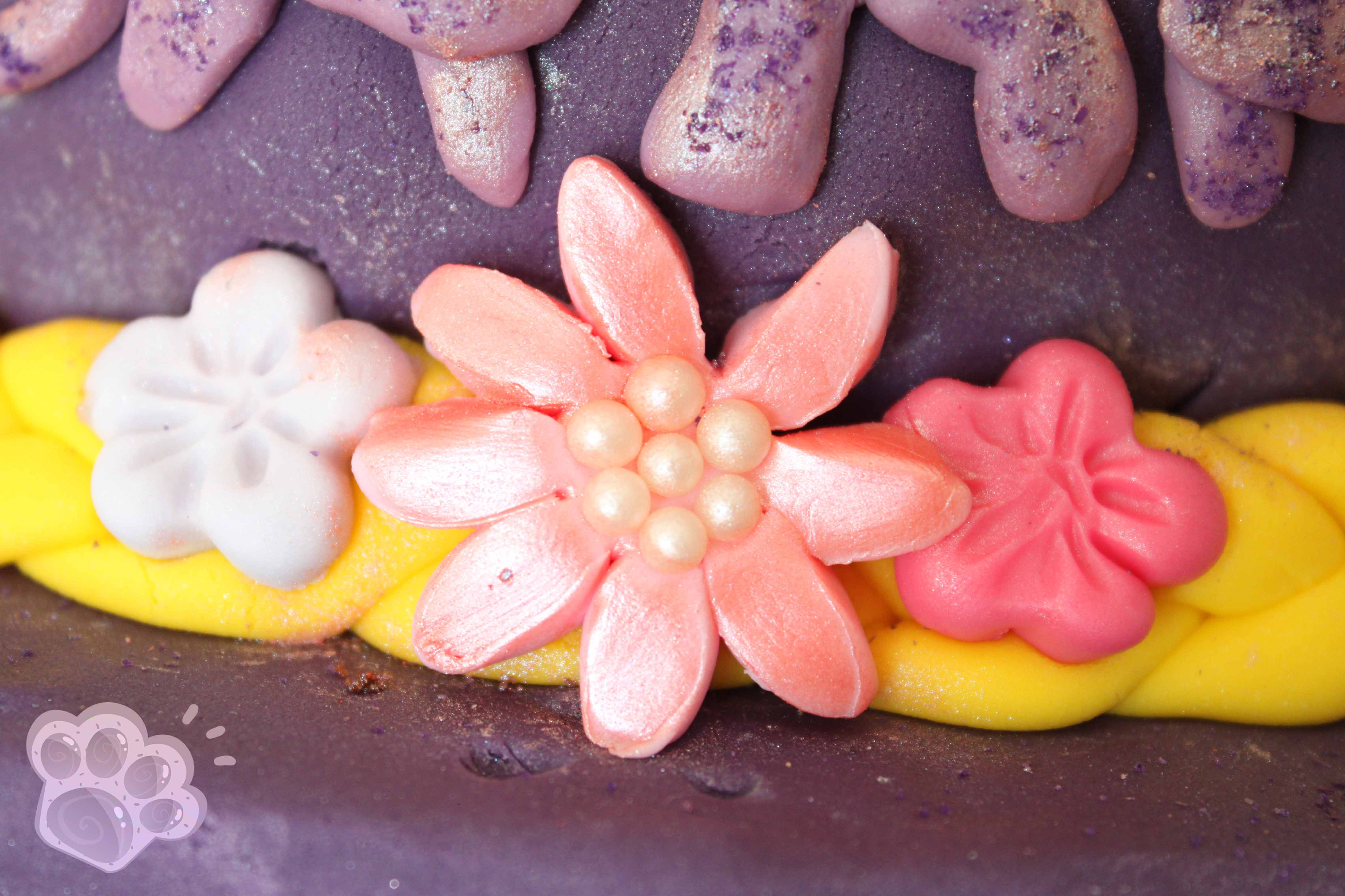 Et des plus complexes avec 2 épaisseurs de fleurs collées en décalé. J’ai ajouté ensuite des petits « poils » en faisant une mini bande de pâte à sucre et avec un ciseau à couture des crans.