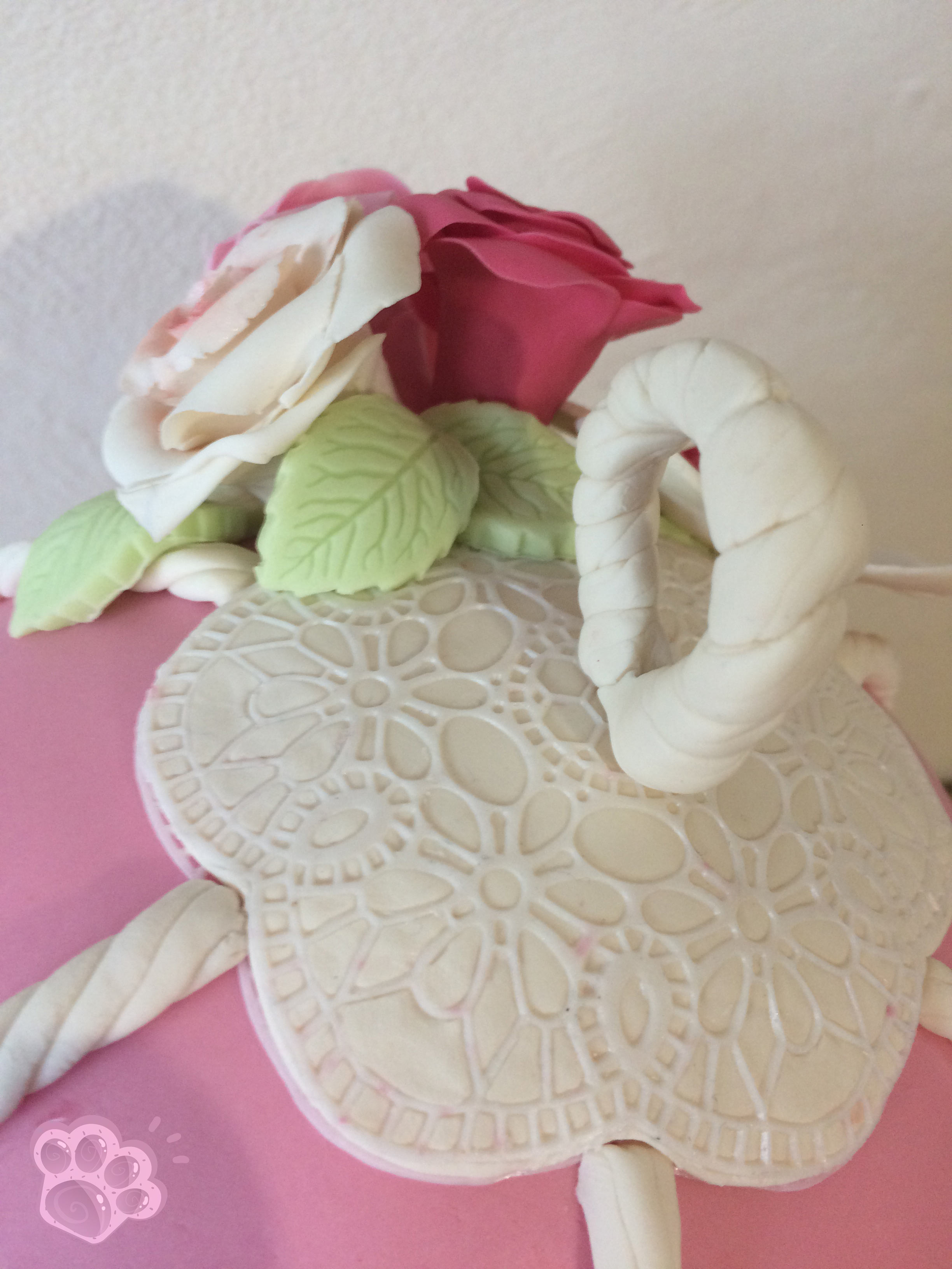 1-Poser le napperon de dentelle blanche sur de la pâte à sucre ivoire étalée et la découper à la même taille en suivant les bords : c’est le haut de la cage. Coller la dentelle sur la pâte à sucre puis l’ensemble bien centré sur le haut de la cage.
