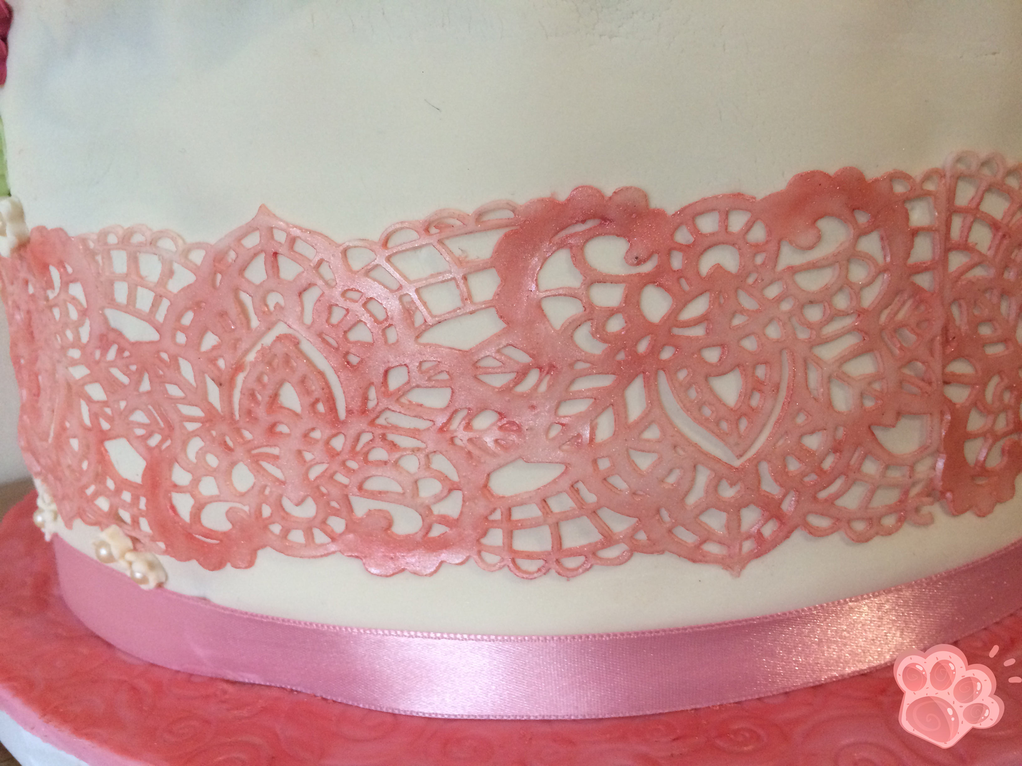 7-Coller la dentelle orchidée bien droite au dessus du ruban (il faut 2 bandes et un morceau) avec un pinceau et un peu d’eau ou de colle alimentaire (CMC + eau)