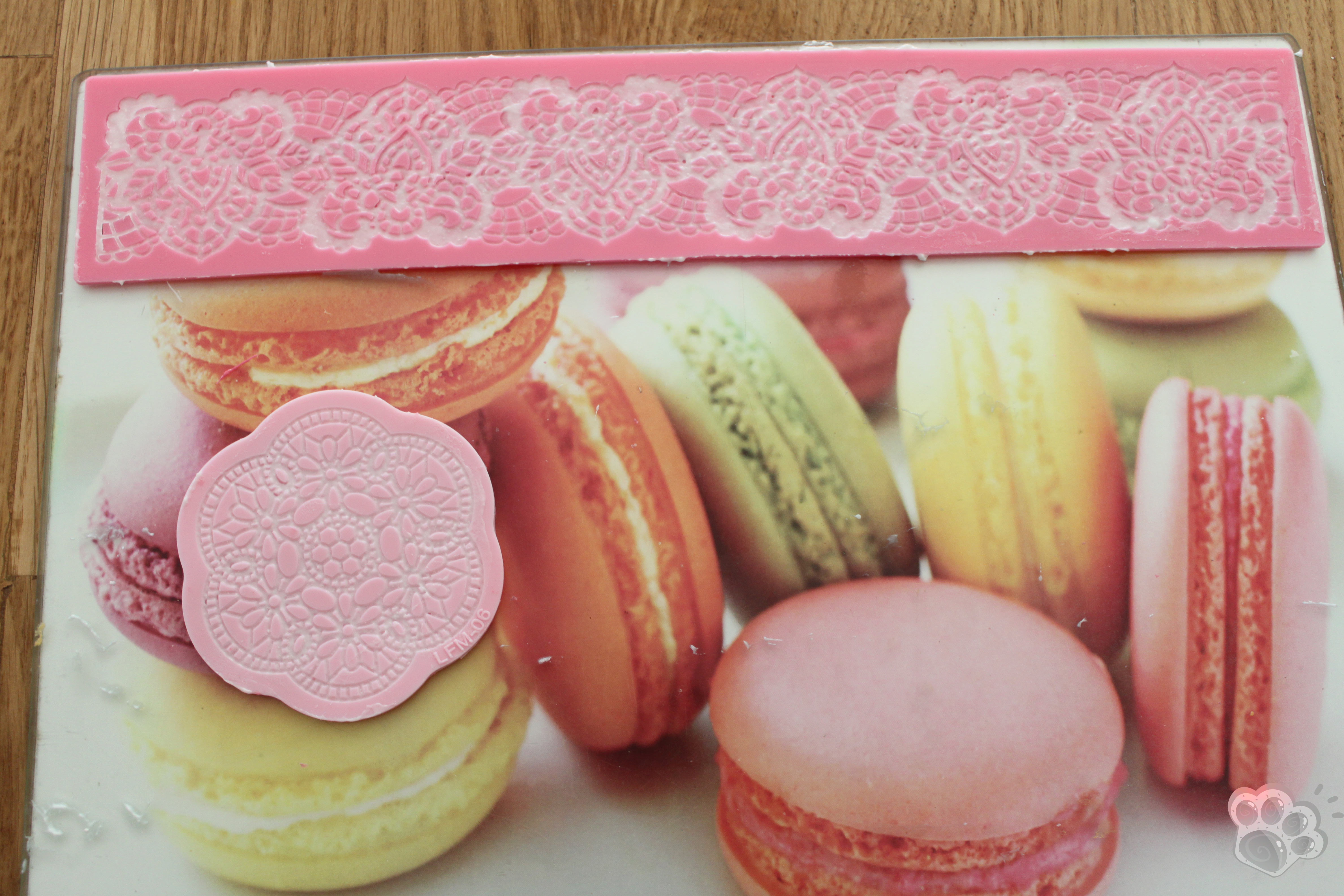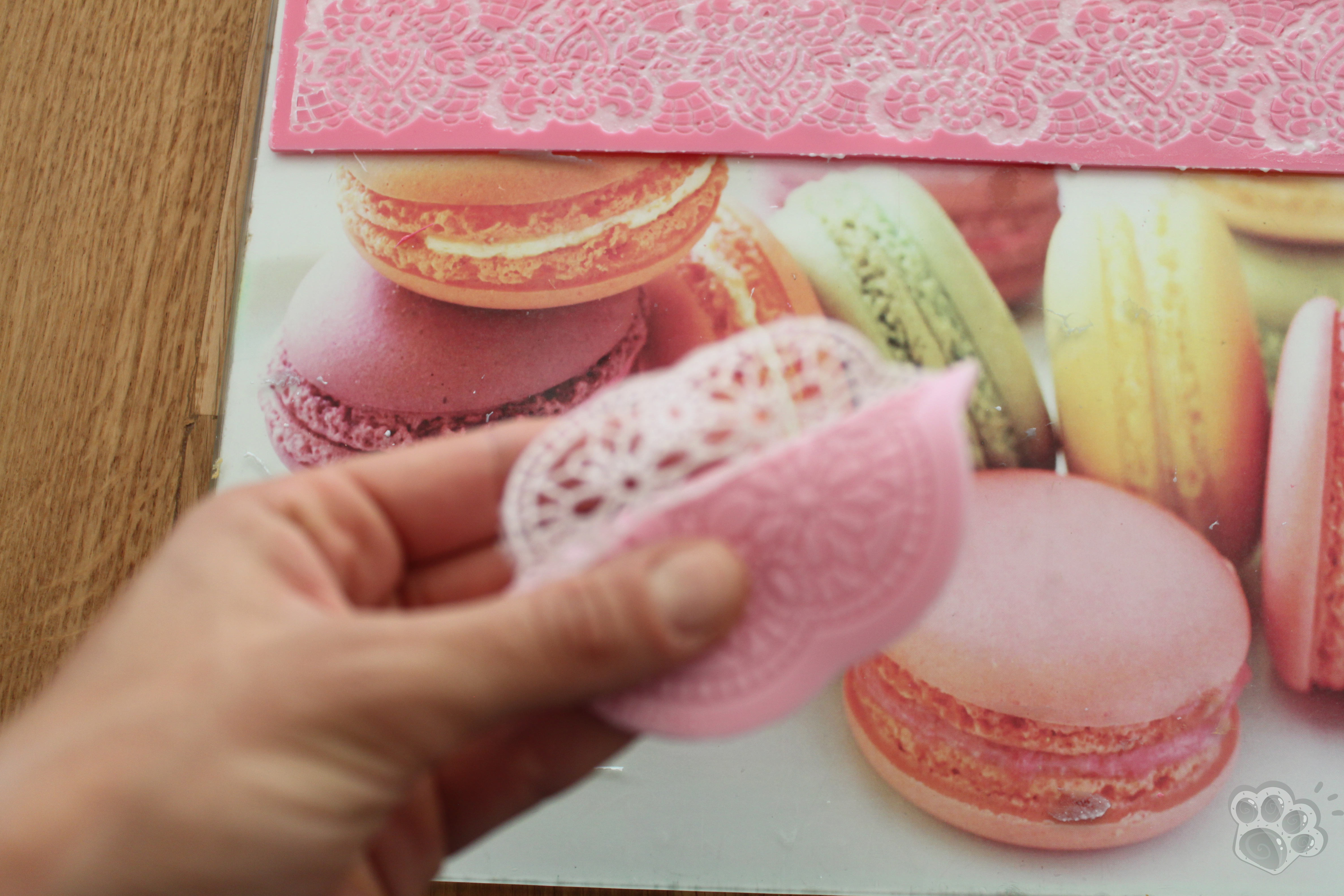 Une fois qu’on a le matériel c’est simple comme bonjour ! On mélange la poudre de sucre dentelle avec de l’eau. Ça devient une pâte qu’il faut simplement répartir dans tous les détails du moule en silicone choisi avec une spatule. Sur le mode d’emploi du sachet ils disent de passer au four etc… mais j’ai fait plus simple : étaler et laisser sécher une nuit à l’air libre ! La magie s’opère le lendemain, la dentelle est prête il suffit de la décoller délicatement (à voir maintenant si ma technique fonctionne aussi dans une région plus humide que la Provence?)