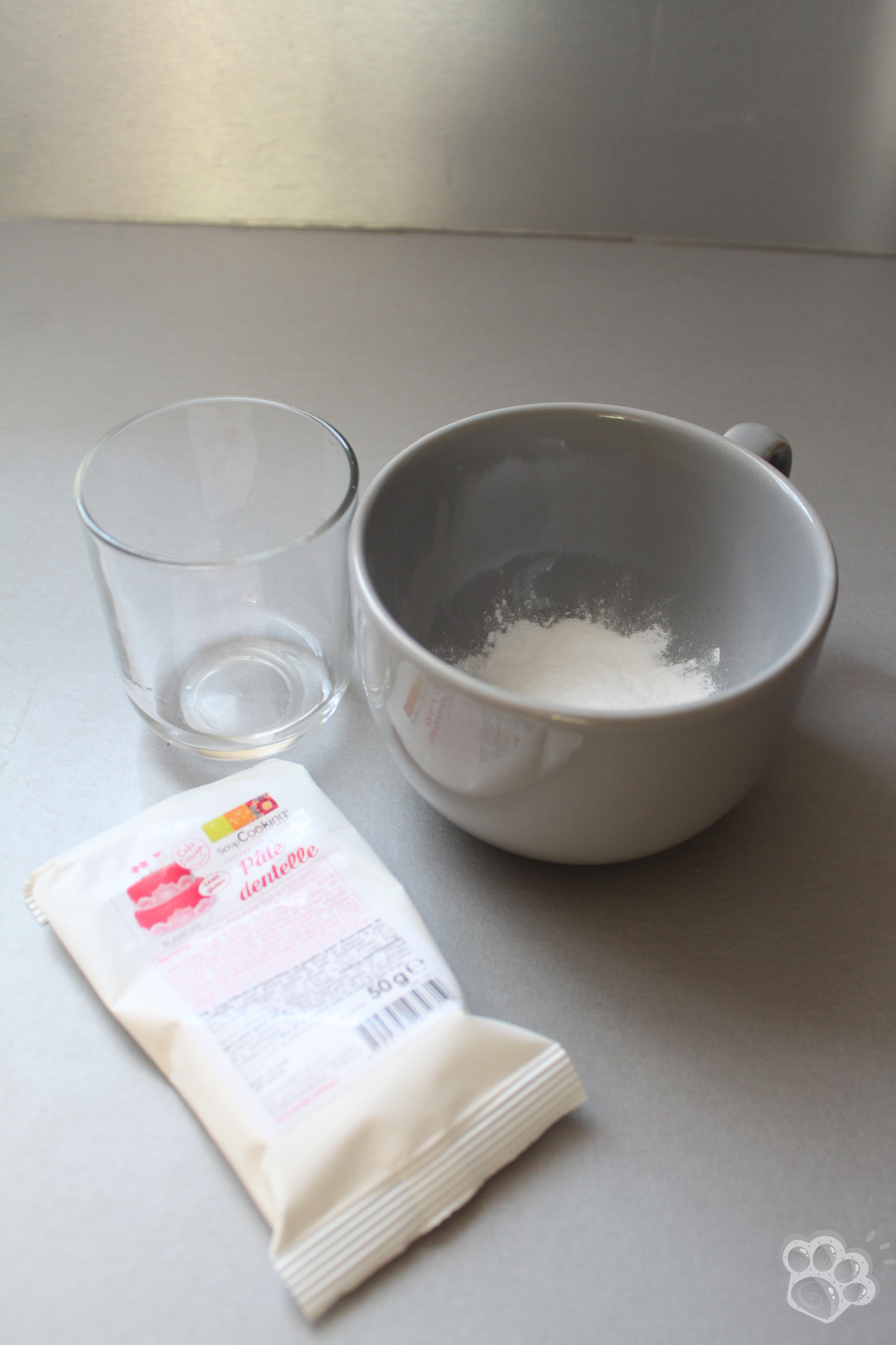 Il suffit d’avoir une simple pochette transparente, de la pâte à sucre et de la CMC = poudre qui permet à la pâte à sucre de durcir beaucoup plus vite et donc de faire tenir les modelages plus facilement (mais cela dit on peut s’en passer)