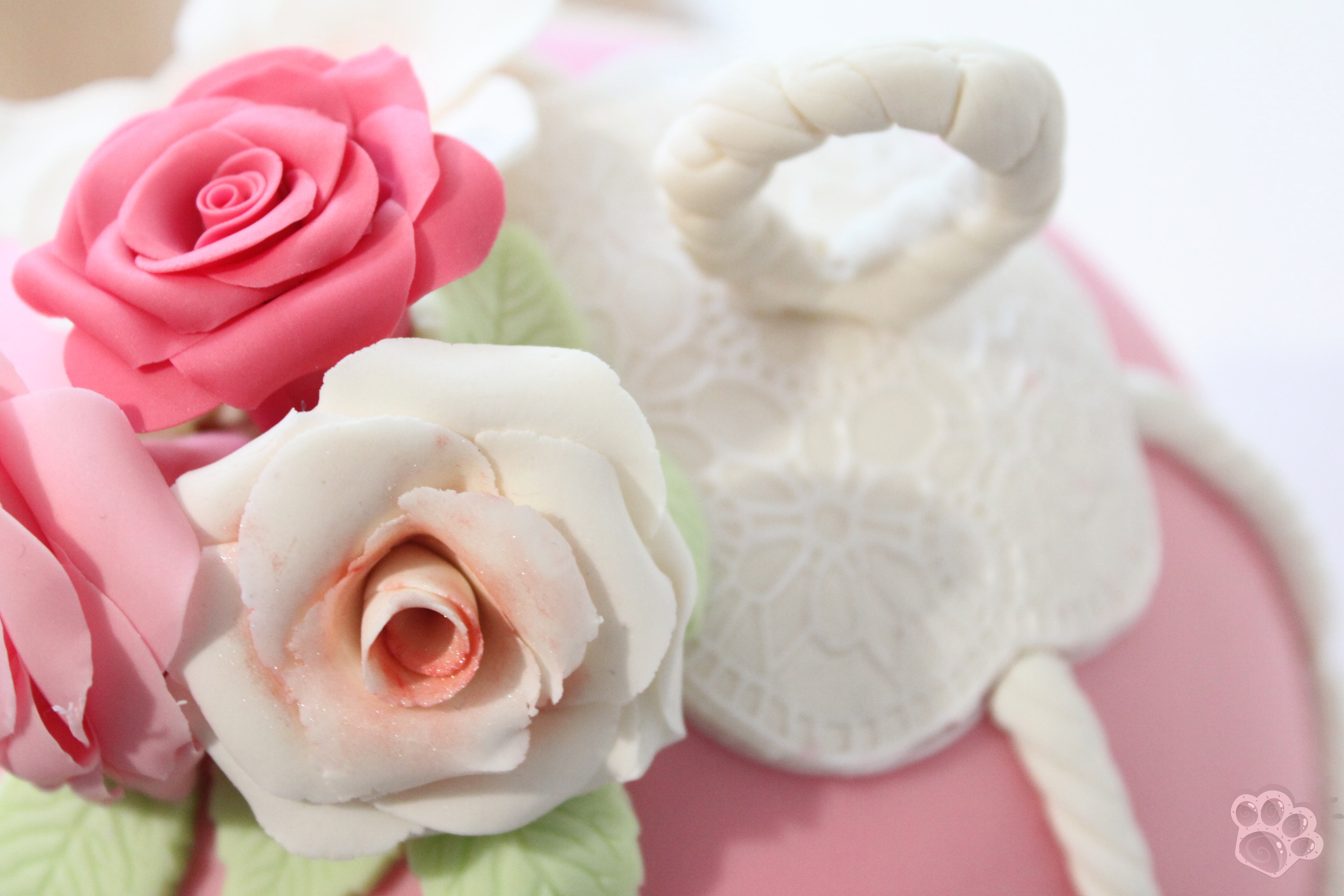 Dès que j’ai reçu le joli faire-part, les couleurs du gâteau étaient fixées : un camaïeu de rose pour les fleurs, de l’ivoire et une touche de vert !