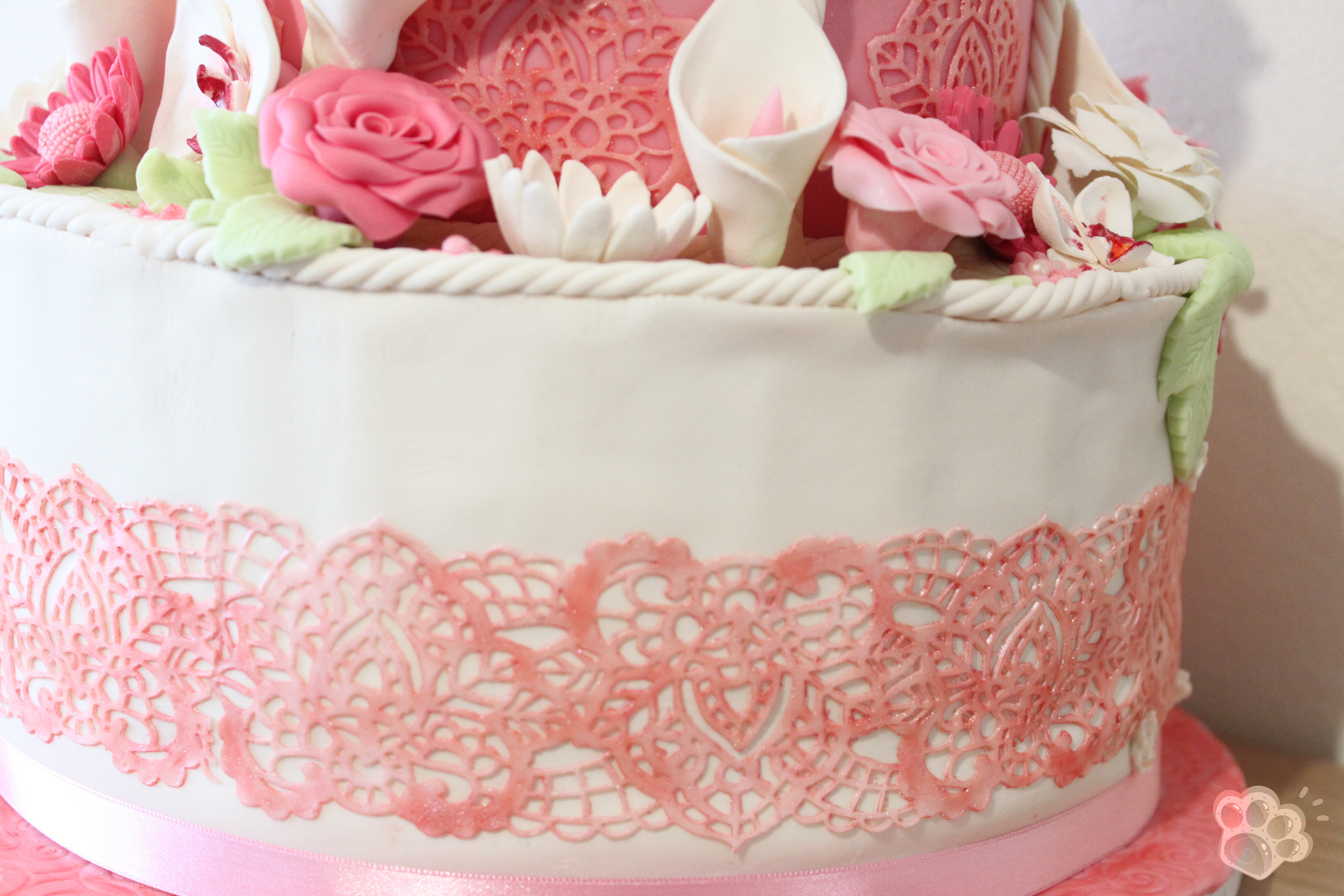 8- En principe il reste exactement 6 orchidées en dentelle dans la 3ème bande, les découper au ciseau et en coller une entre chaque barreau de cage sur le gâteau du haut. Ça fait un rappel du bas du gâteau derrière les fleurs.