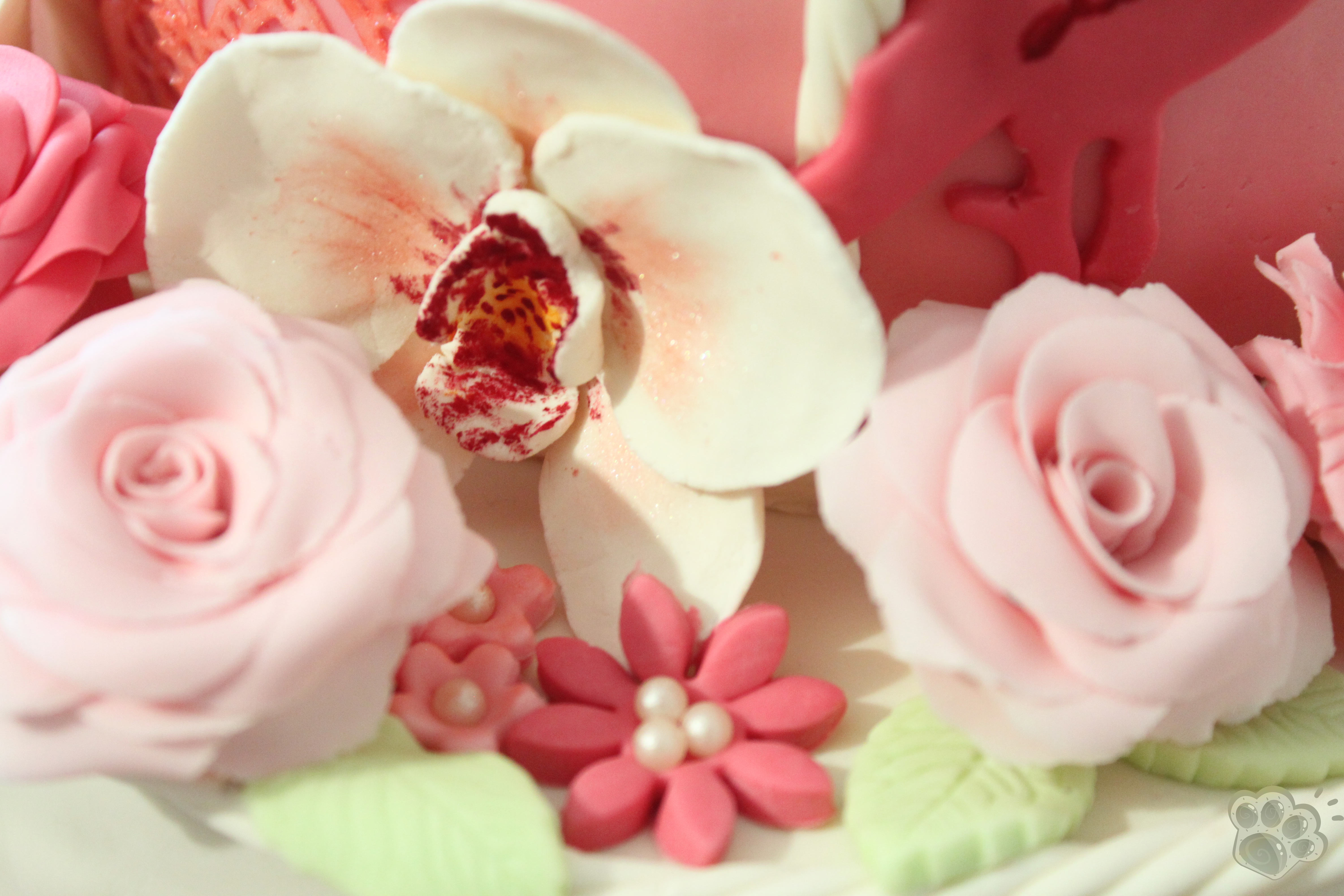 La dentelle en sucre représentant des orchidées, il a bien fallu que j’en mette dans les fleurs pour parfaire l’ensemble.