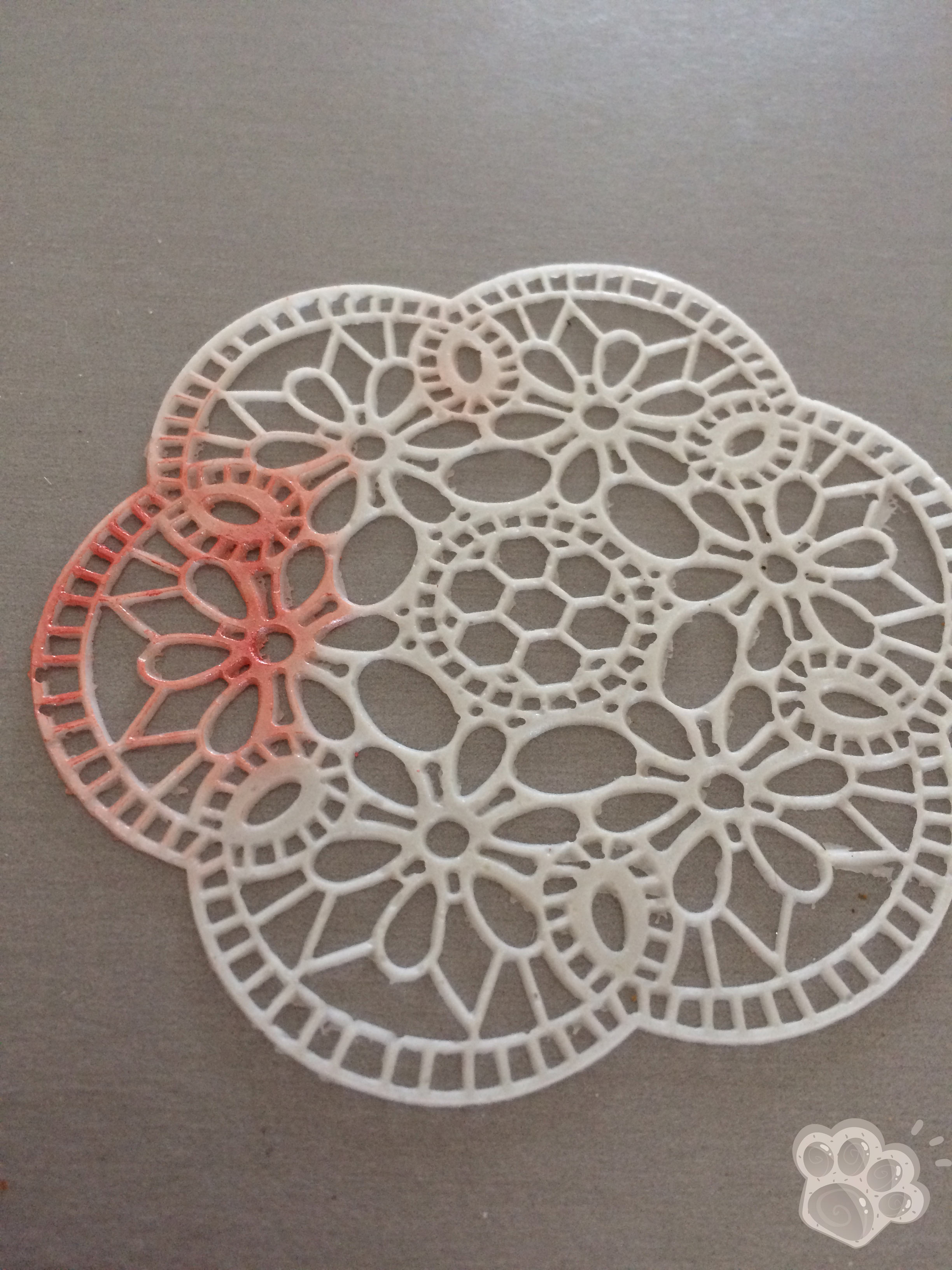 La dentelle est blanche bien entendu au départ, là c’est un choix de ma part de l’avoir colorisée au pinceau avec de la poudre rose nacrée qui donne les nuances irrégulières.