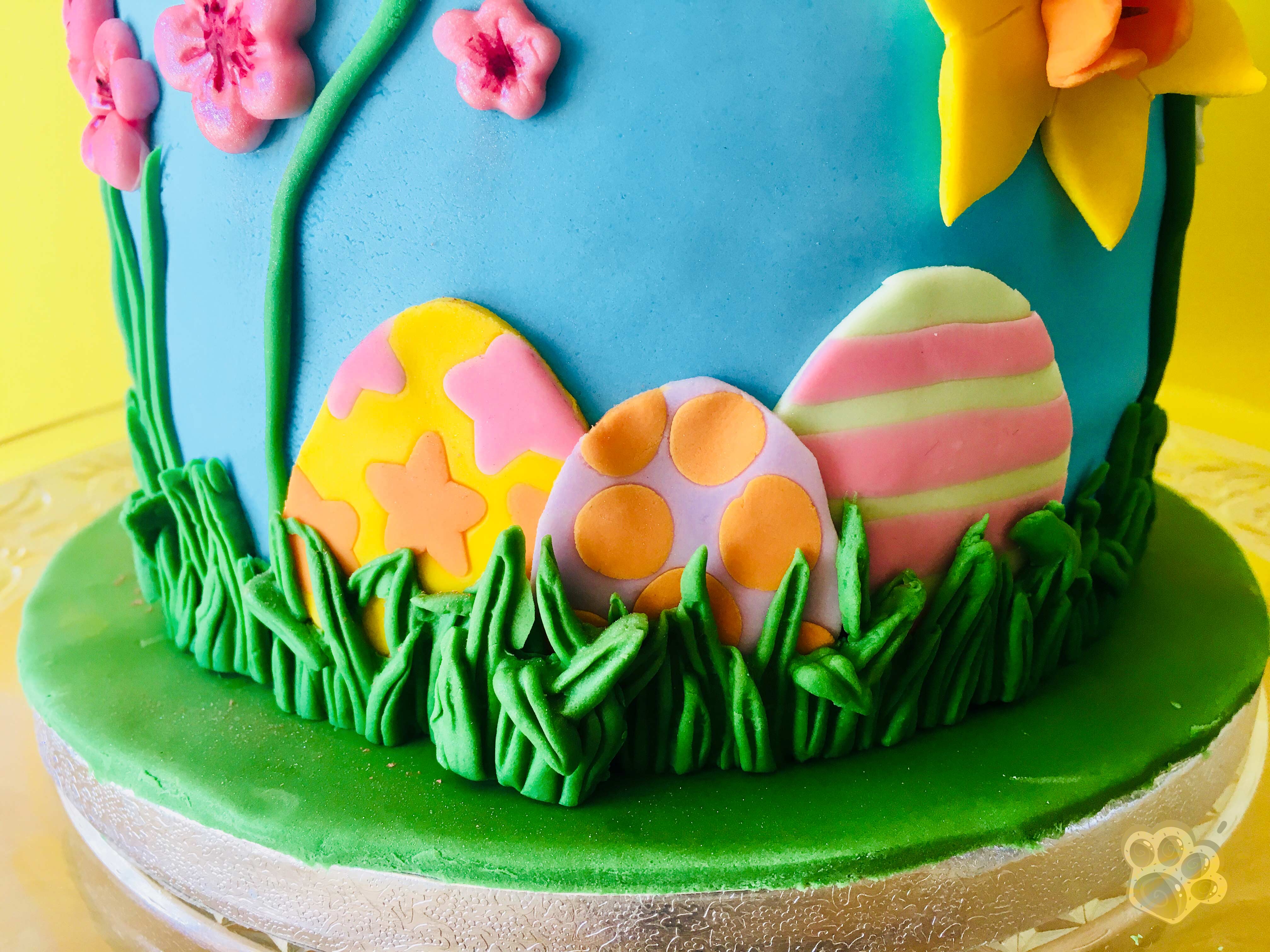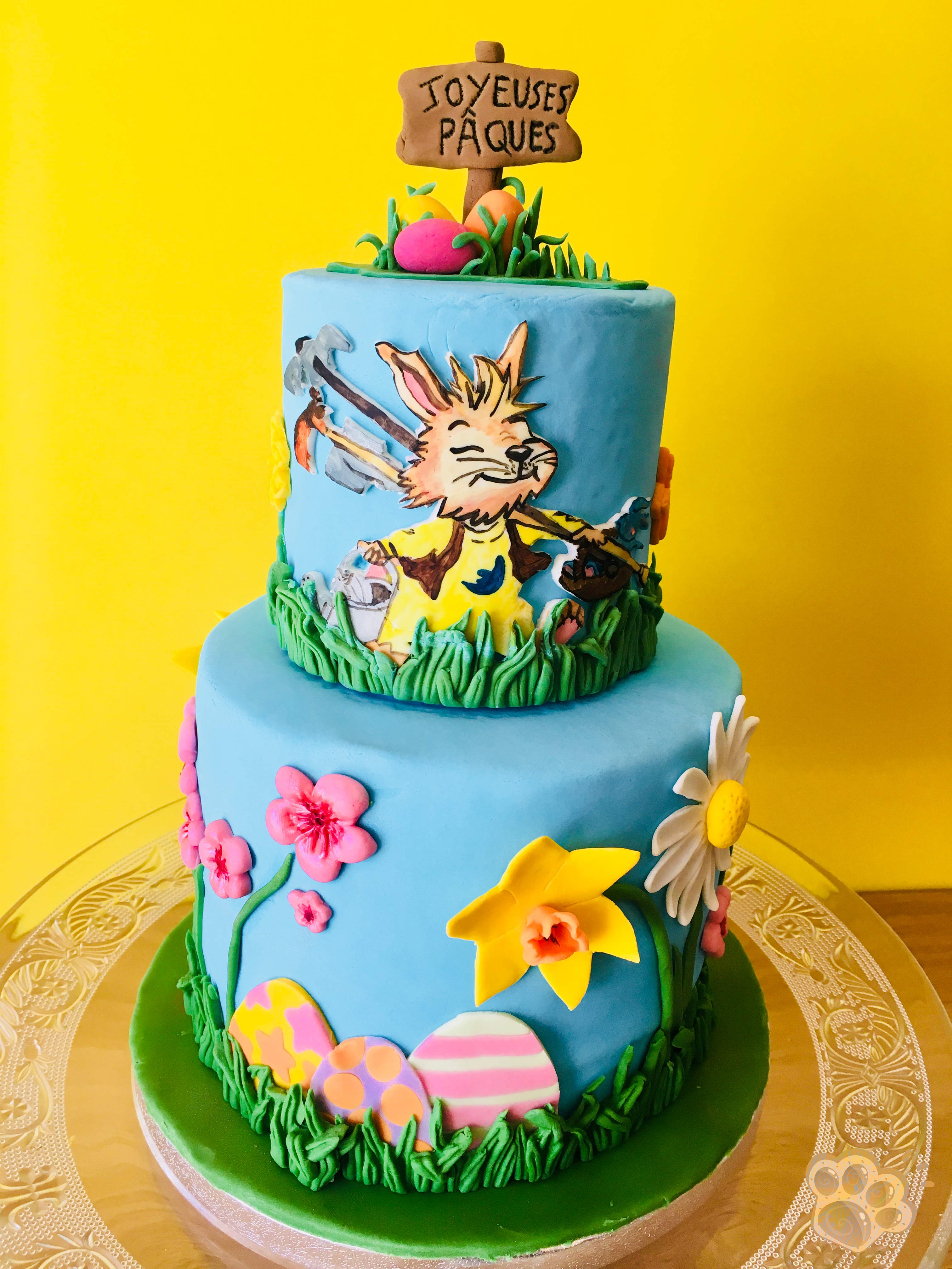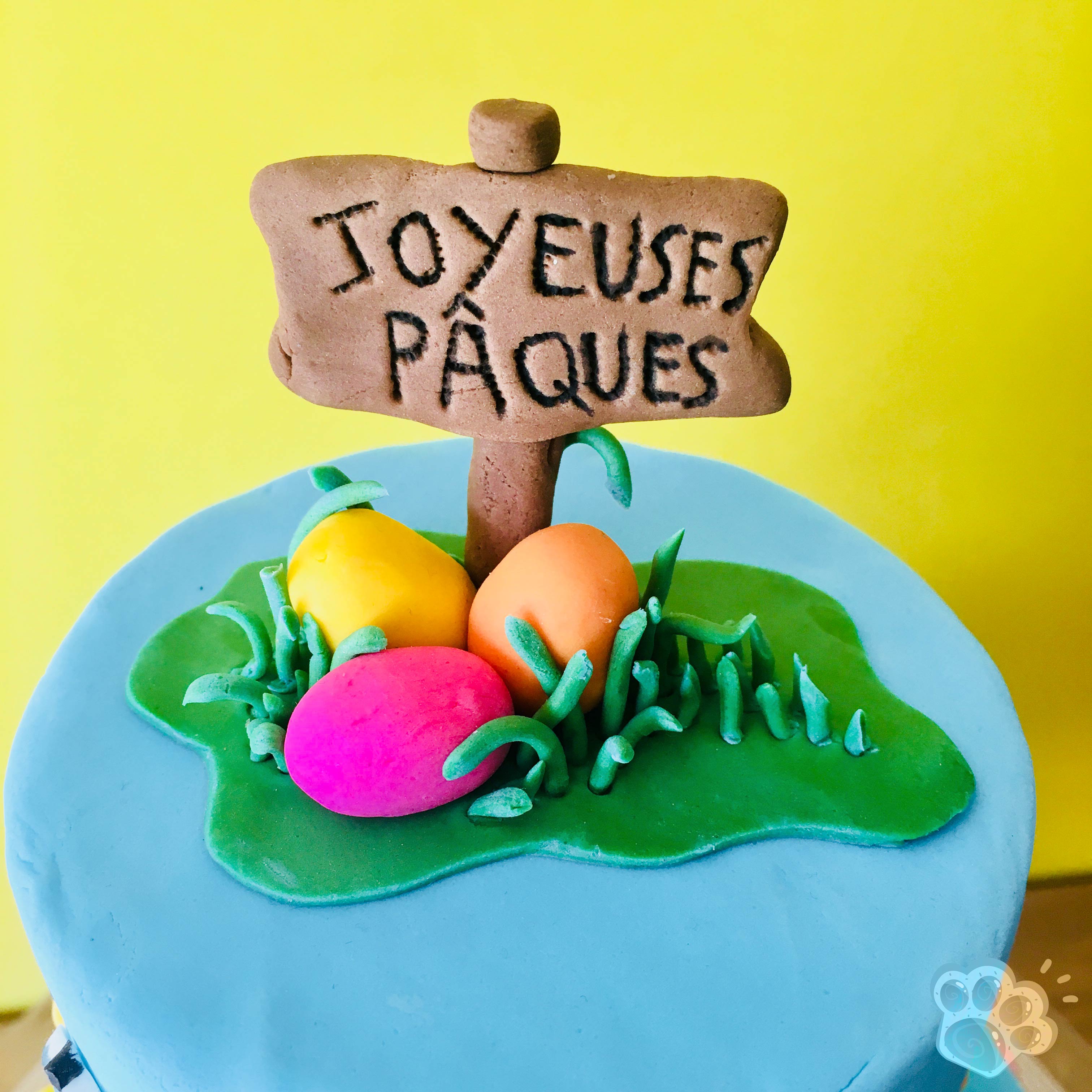 Voici mon gâteau de Pâques version 2018 avec ses décors en pâte à sucre sur sa délicieuse génoise à la vanille, simple et festif : à vos fourneaux!