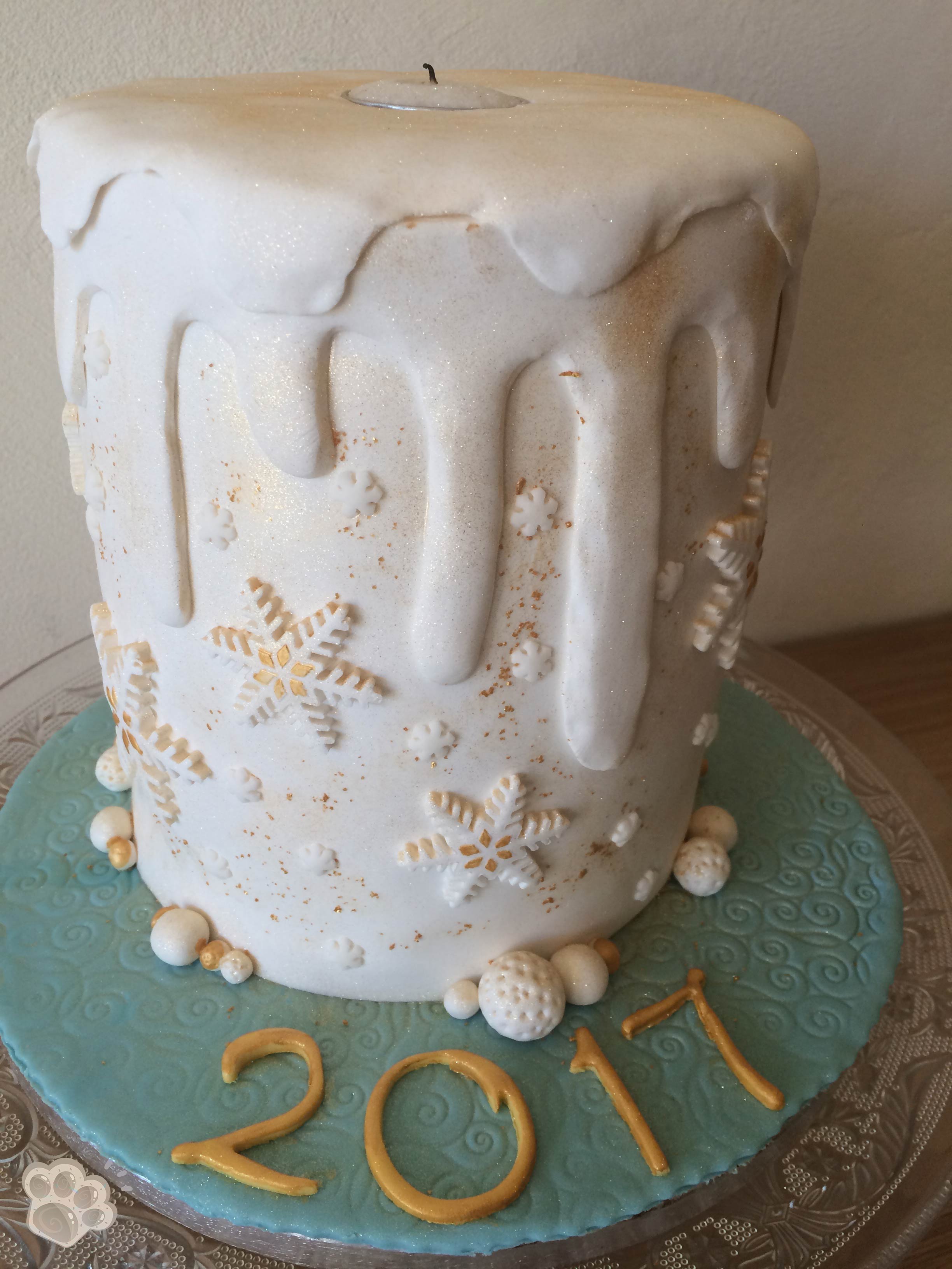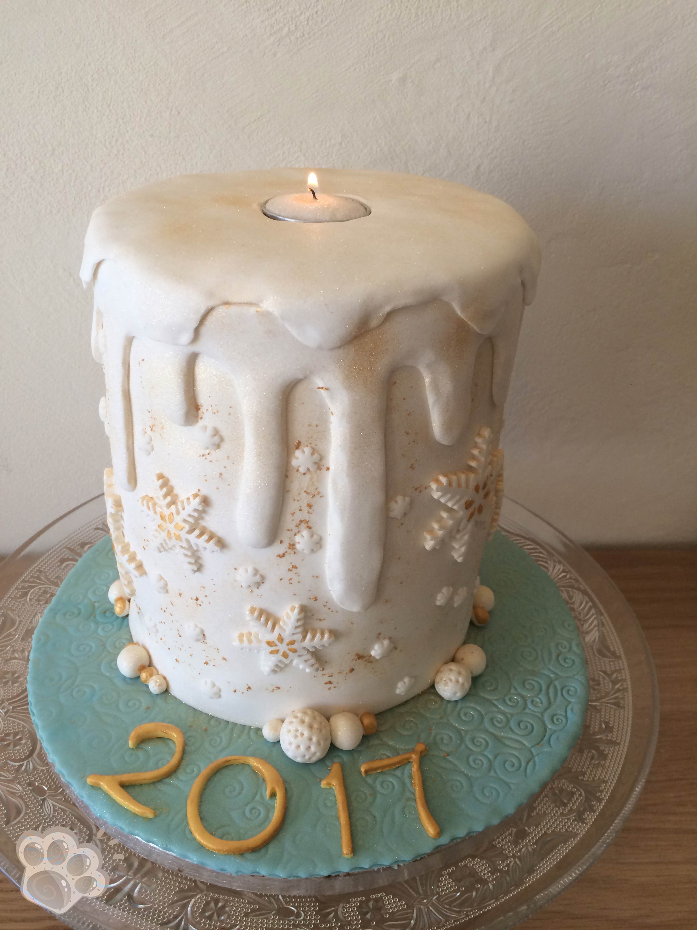 L’ensemble est recouvert de pâte à sucre blanche : un grand rectangle pour le tour puis un disque au dessus et enfin un 2ème disque avec des « coulures » de bougie.