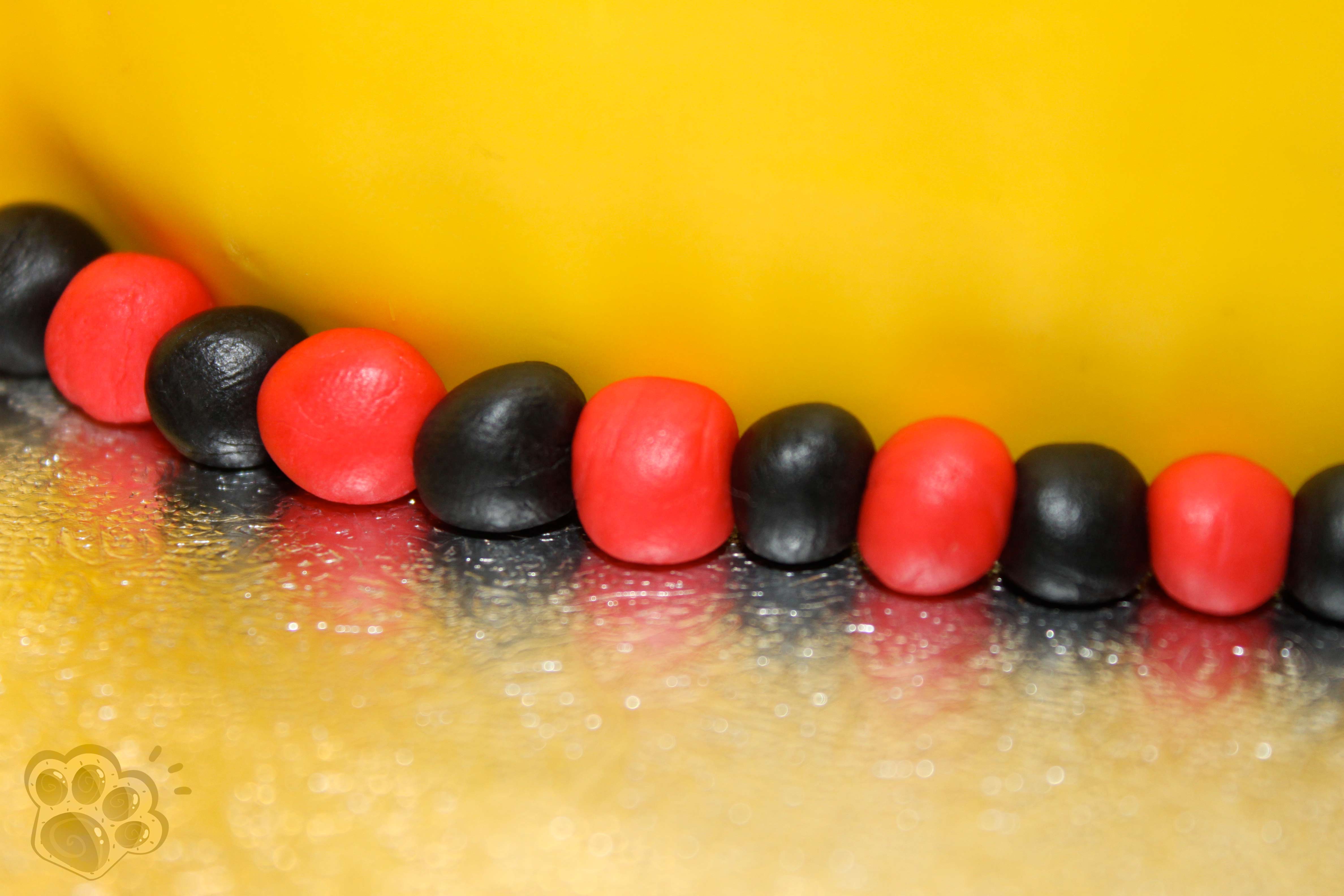 Je termine par faire tout le tour du gâteau avec des petites boules rouges et noires en alternance. Et voilà !