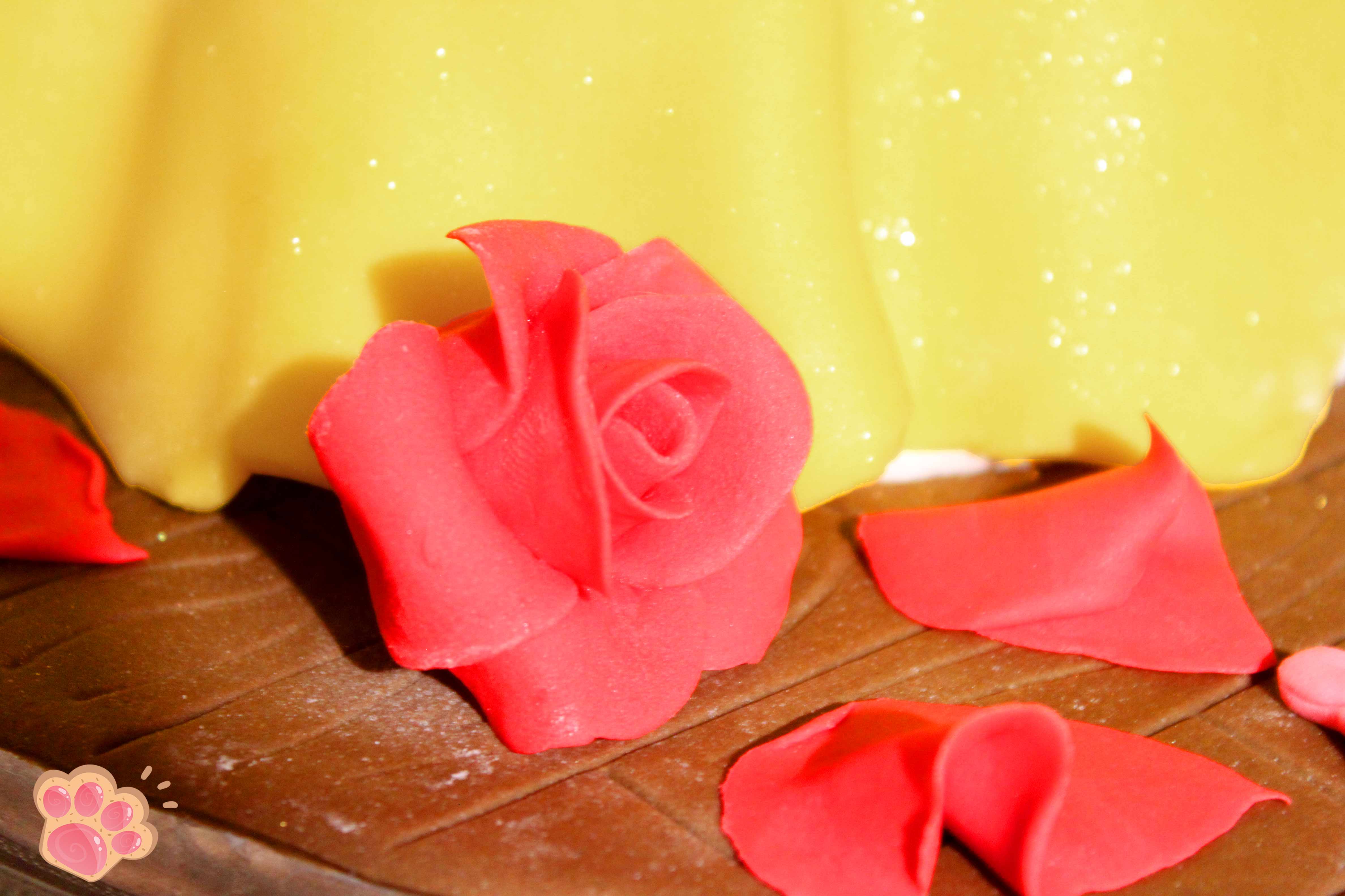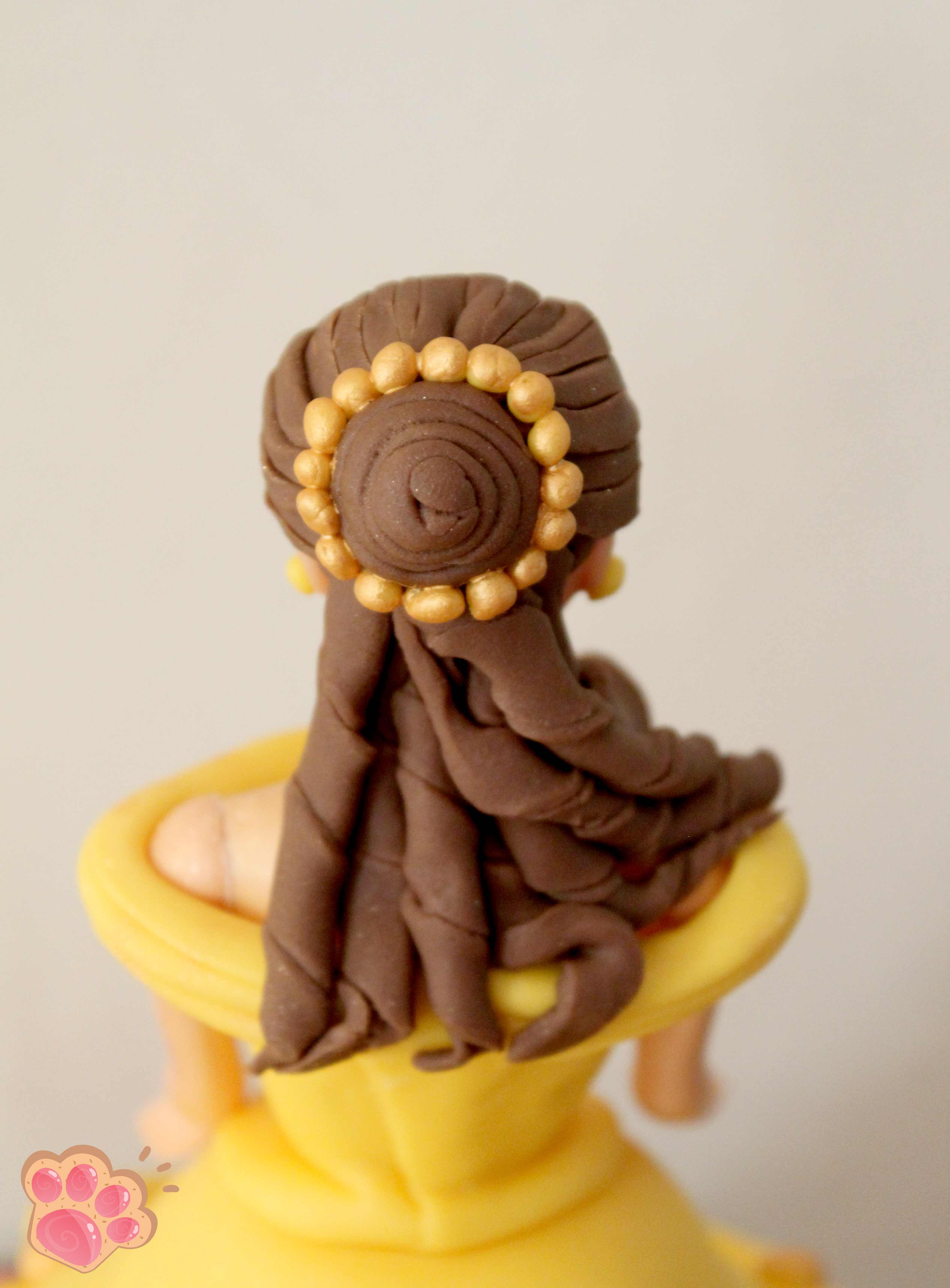 6-Une fois le gâteau froid, le couper en 3 parties et garnir de Nutella. Je fais des creux dans le gâteau pour que la robe de Belle fasse des plis plus jolis. Enduire ensuite tout l’extérieur avant de coller la pâte à sucre blanche qui fera le bas du jupon de Belle et enfin la pâte à sucre jaune par dessus. Piquer ensuite le buste en plastique et le recouvrir de pâte à sucre jaune pour faire le haut de la robe.