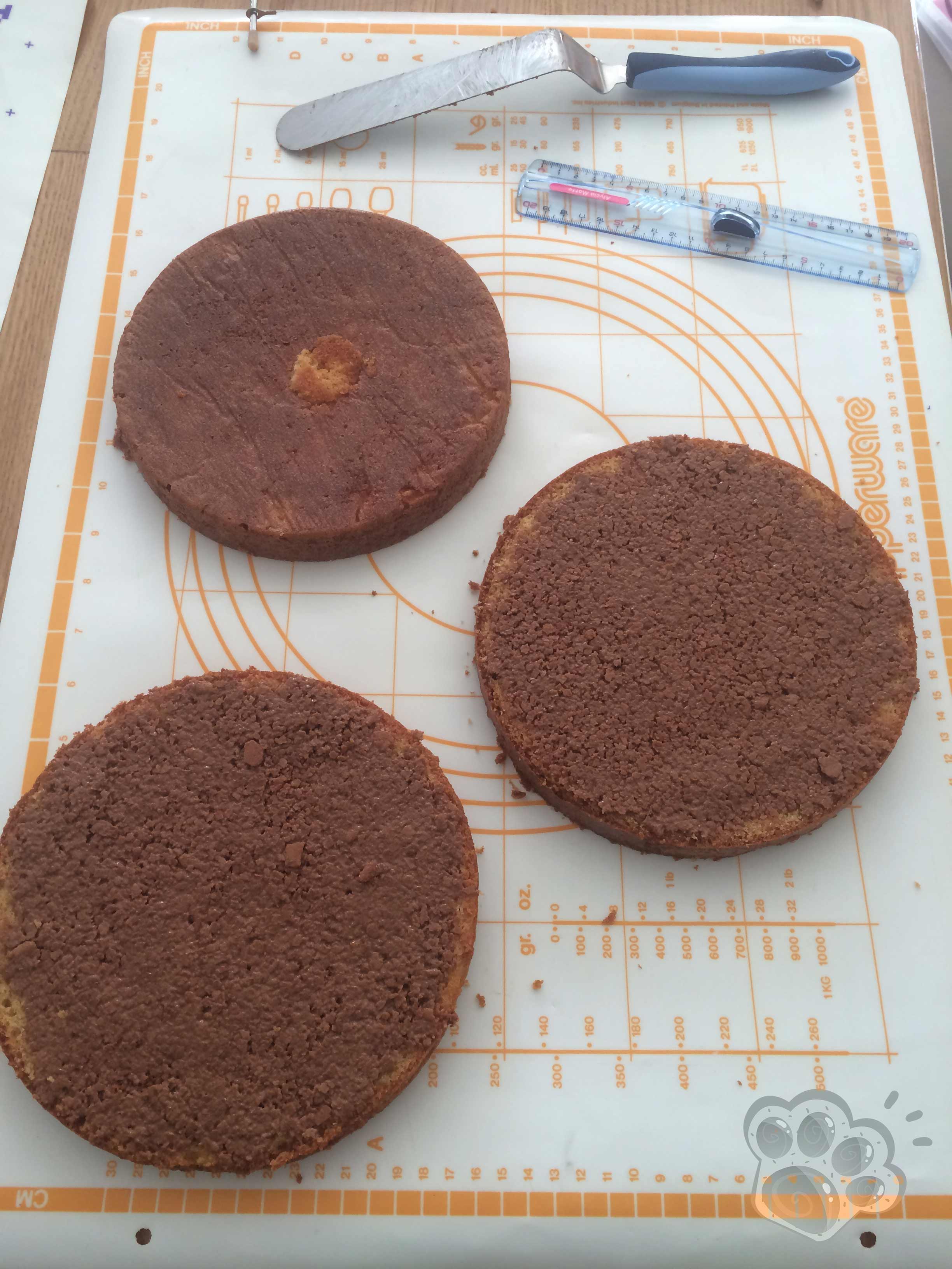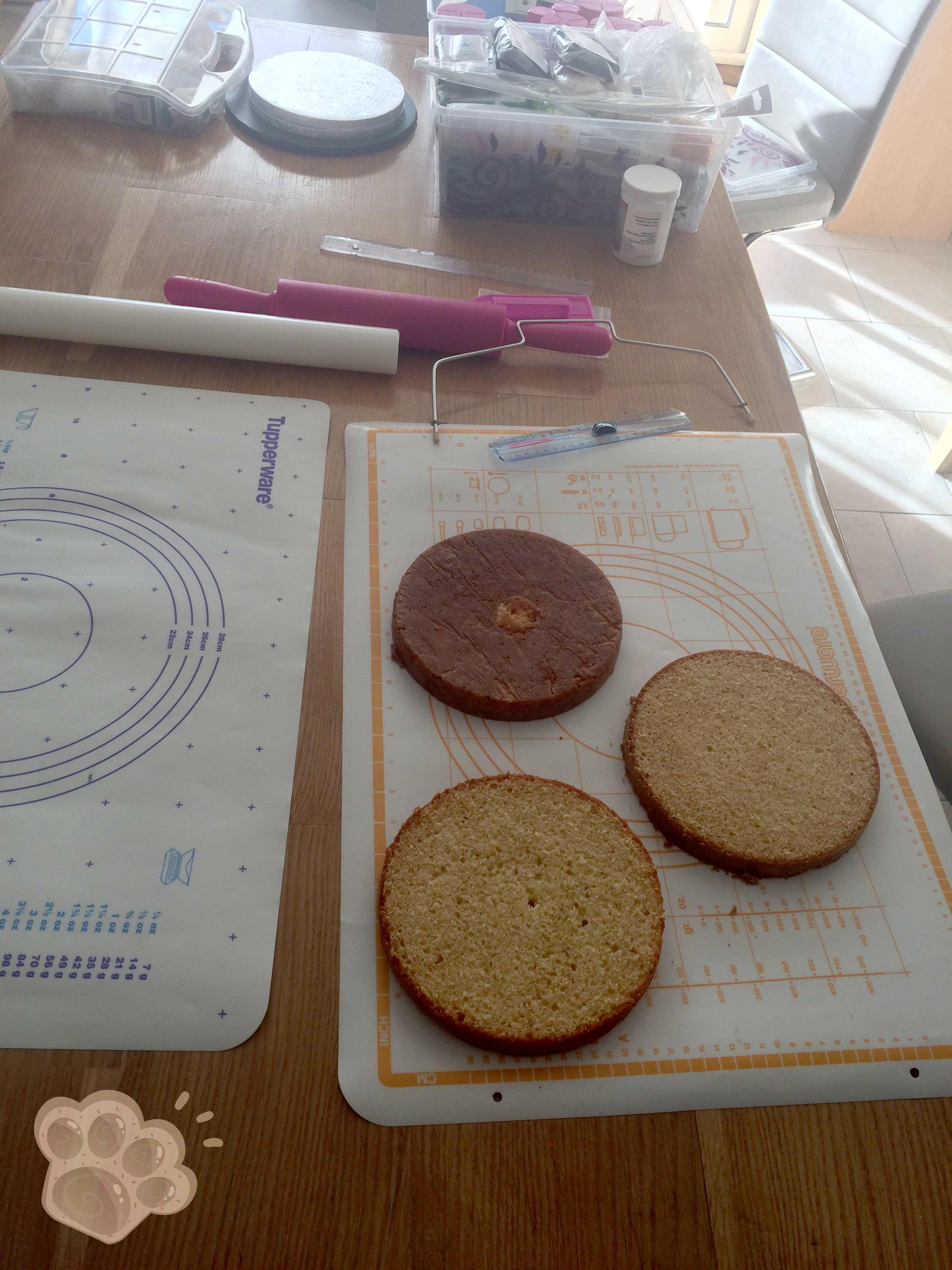 Comme la base de mon gâteau ne se mangera pas (nous ne seront pas assez nombreux!), il est possible de la faire longtemps à l’avance (ici 1 semaine avant l’anniversaire).