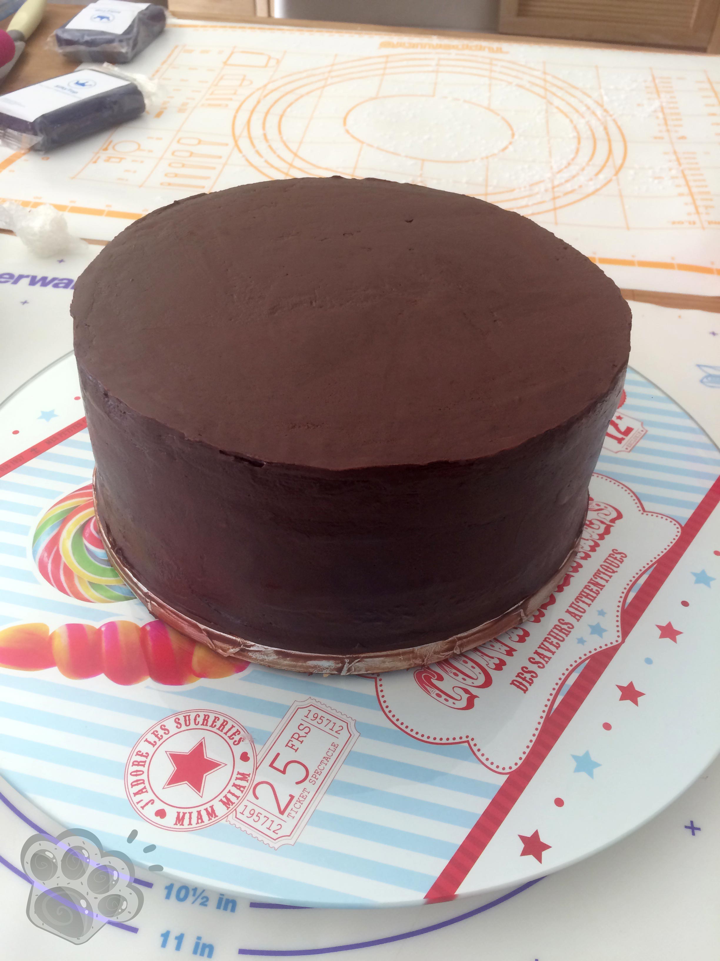Ce gâteau sera fourré de ganache au chocolat au lait (ma recette ici) et recouvert de ganache au chocolat noir (ma recette ici).