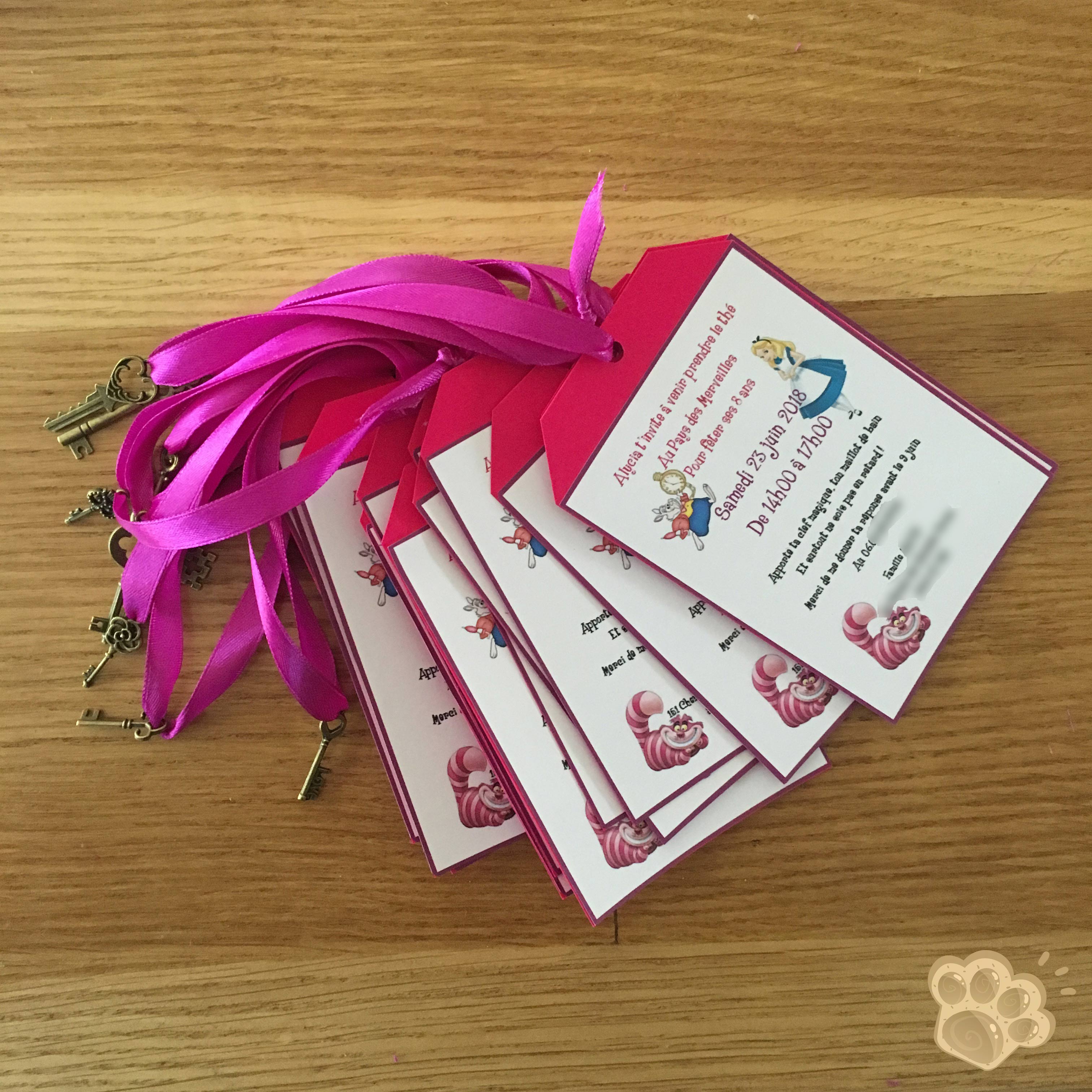 J’ai commandé sur Aliexpress de toutes petites clés forme ancienne qui m’ont fait penser à la partie du dessin animé où Alice doit trouver la bonne clé pour ouvrir la serrure. Elles sont attachées aux invitations avec un joli ruban fuchsia. Voici le texte des invitations :