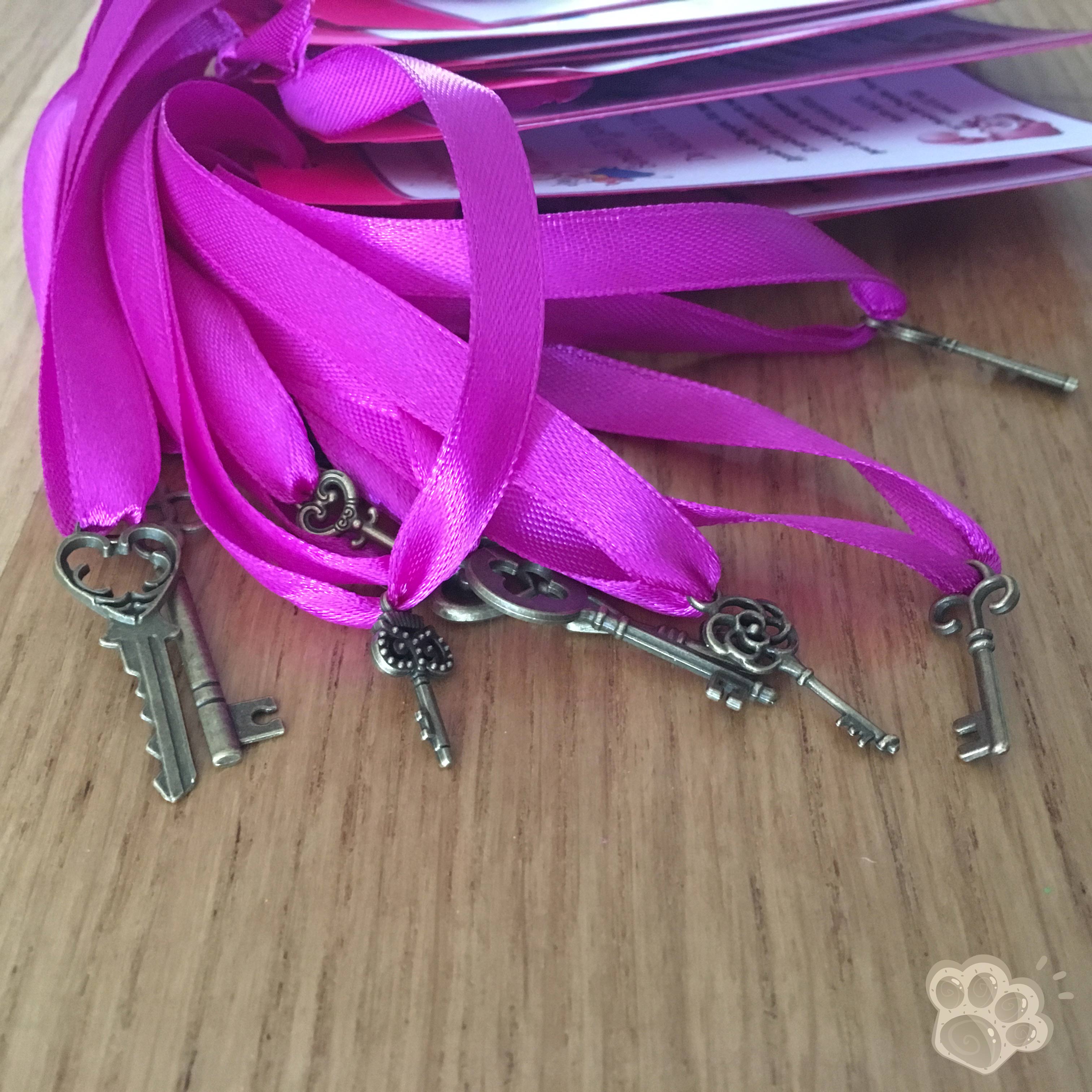 2-Découper et coller les invitations sur des cartons fuchsia, couper les angles puis ajouter un ruban et une petite clef (la carte ressemblera à un porte-clef)