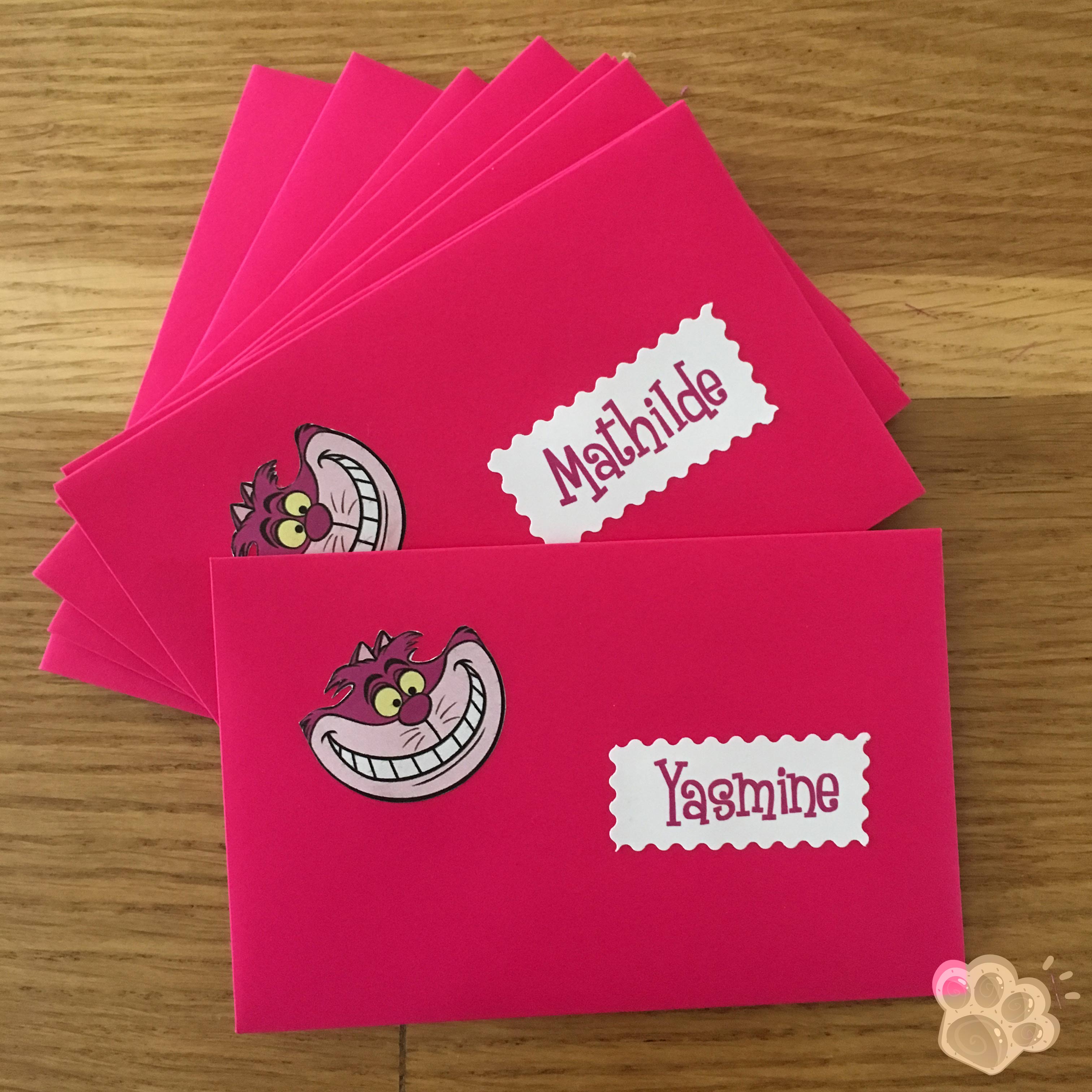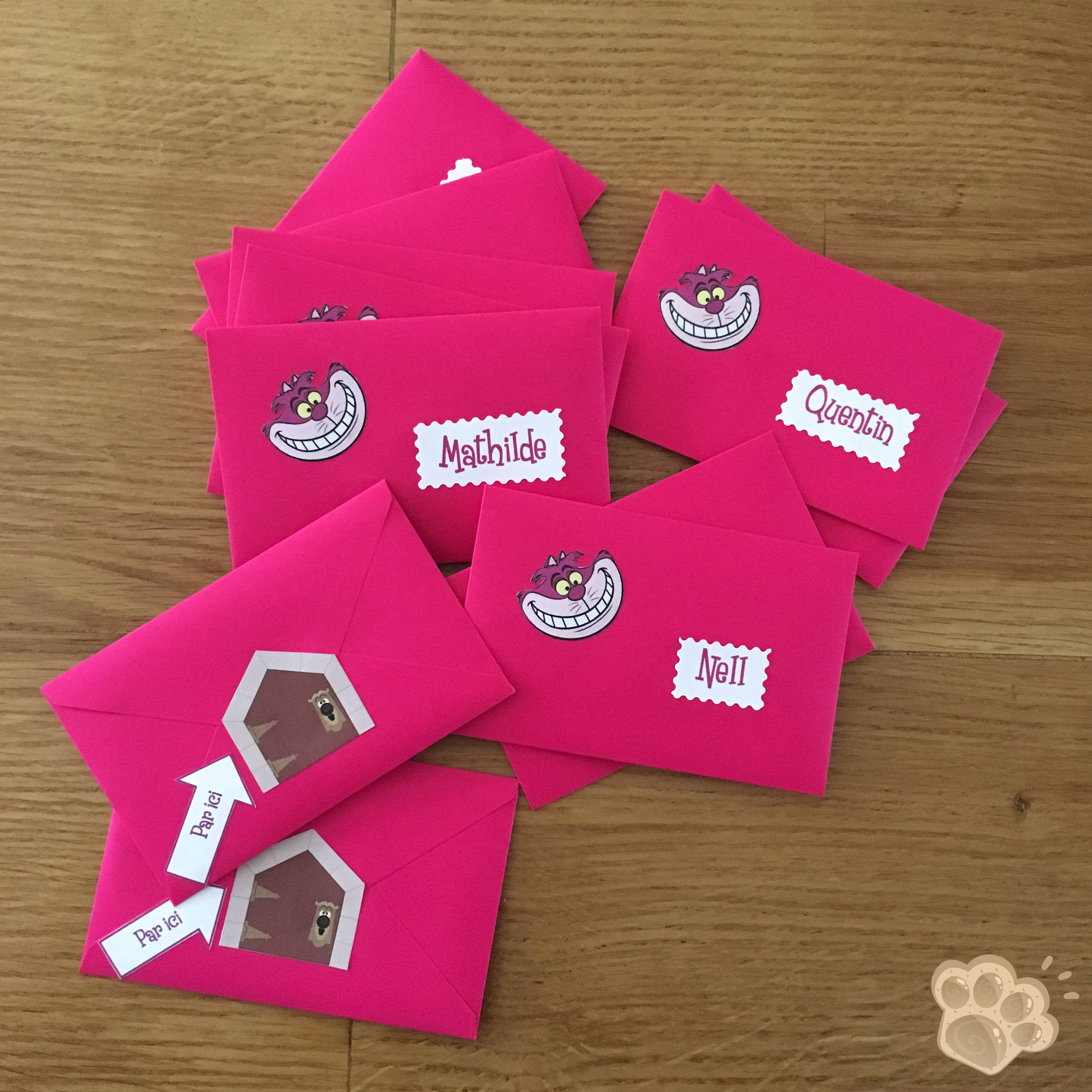 3-Décorer les enveloppes : devant le prénom de l’enfant invité et la tête du chat Chester, derrière la porte d’Alice au pays des merveilles et une flèche « par ici »